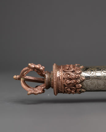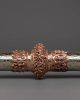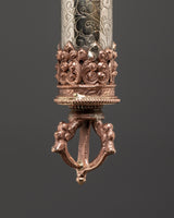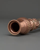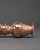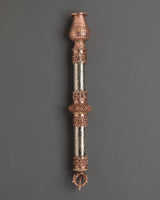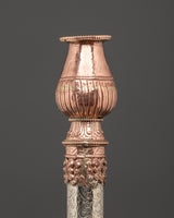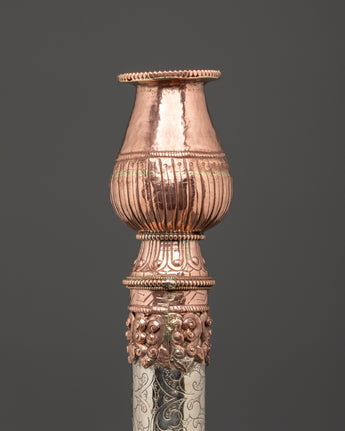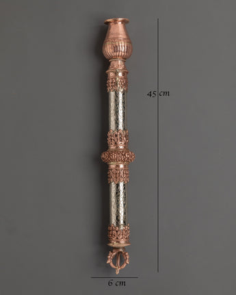 Enhance your meditation and spiritual rituals with this exquisite Tibetan copper incense holder, masterfully handcrafted to provide both beauty and value to your sacred place. This incense holder, which measures 45 cm in height and 6 cm in breadth, is made of copper and features attractive white metal details. With a total weight of 0.90 kg, it provides a dependable construction suitable for firmly holding incense sticks during prayer or meditation periods. This incense burner is both a utilitarian tool and a stunning ornamental element, adding to any spiritual setting with its elaborate metalwork and traditional Tibetan craftsmanship.