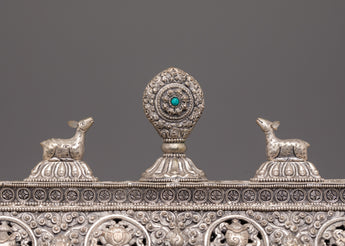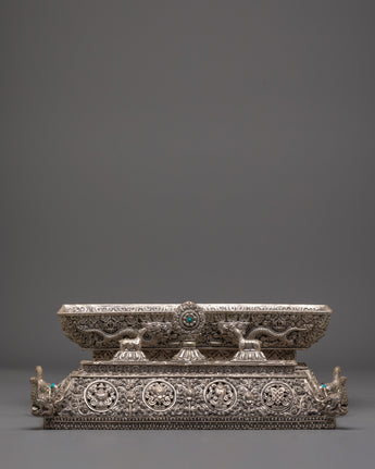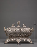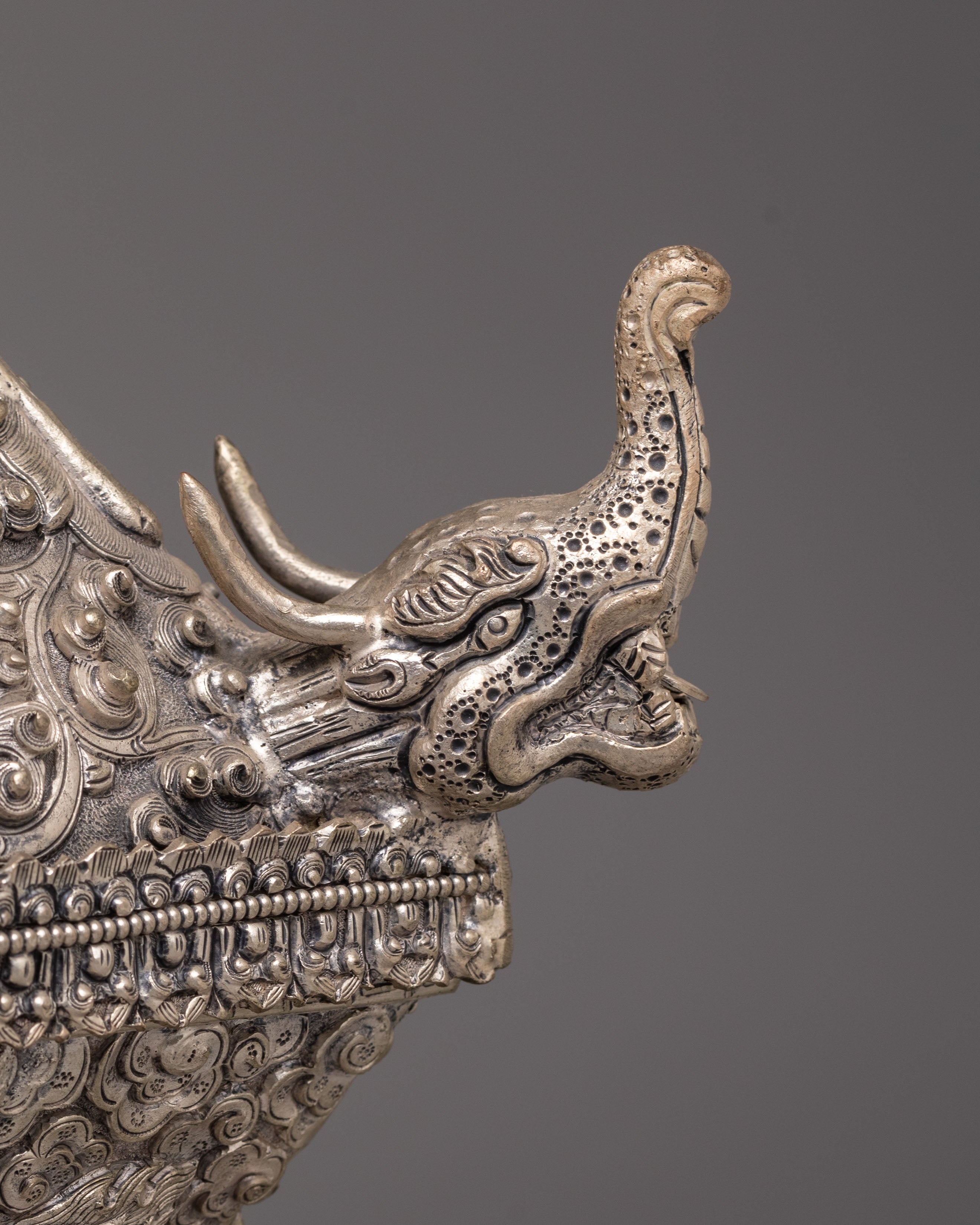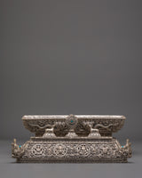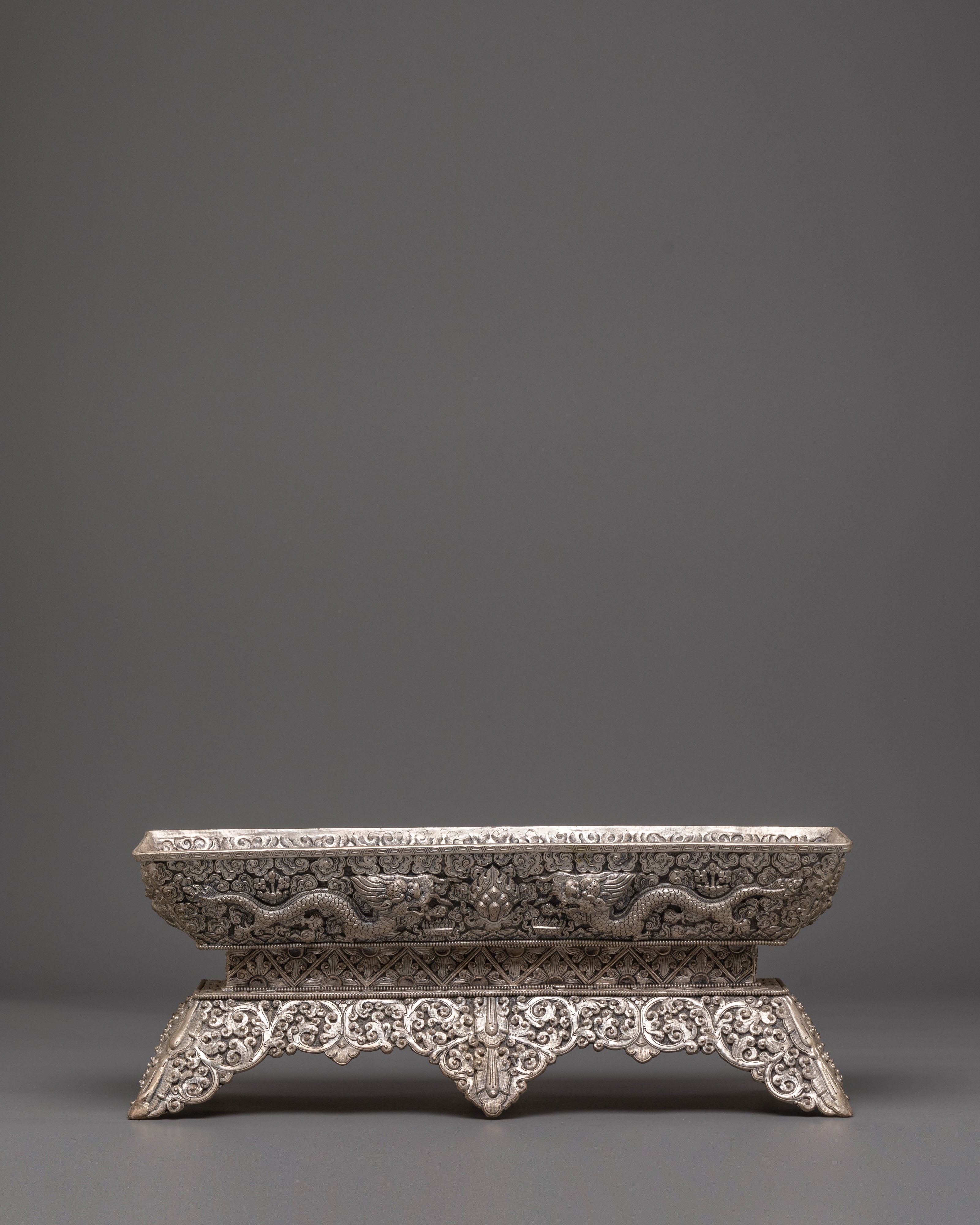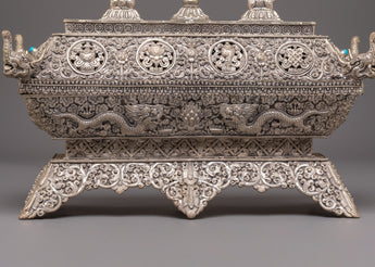 This Tibetan Handcrafted Incense Burner stands at a striking 33 cm in height and boasts a substantial base of 44 cm, providing both a stable foundation and a visually commanding presence. The body of the burner is crafted from copper, known for its rich, warm tone. The copper is beautifully plated with silver, giving it a sophisticated finish that enhances its appeal. This combination of materials not only improves the piece's aesthetic appeal but also reflects the deep spiritual traditions of Tibetan craftsmanship.