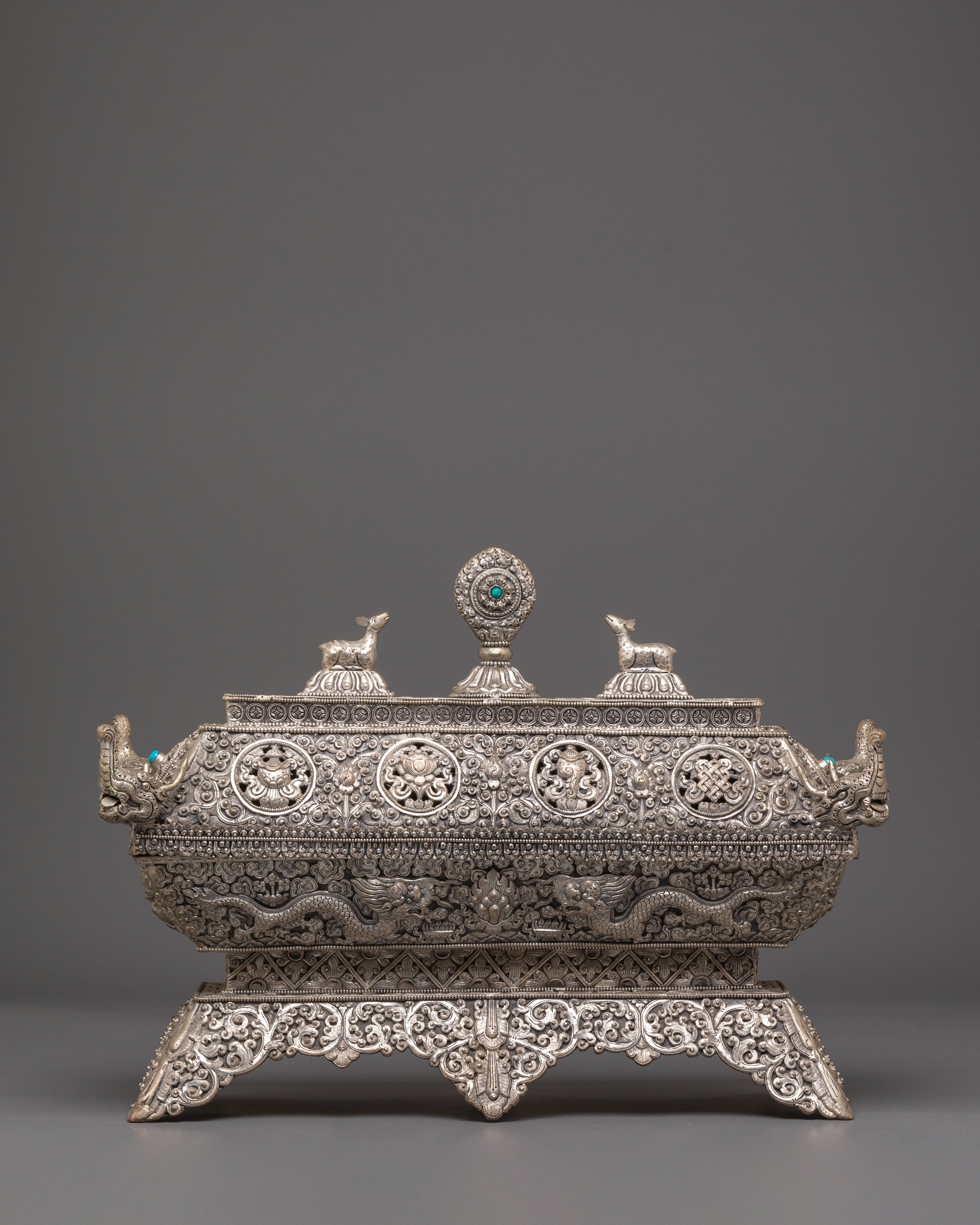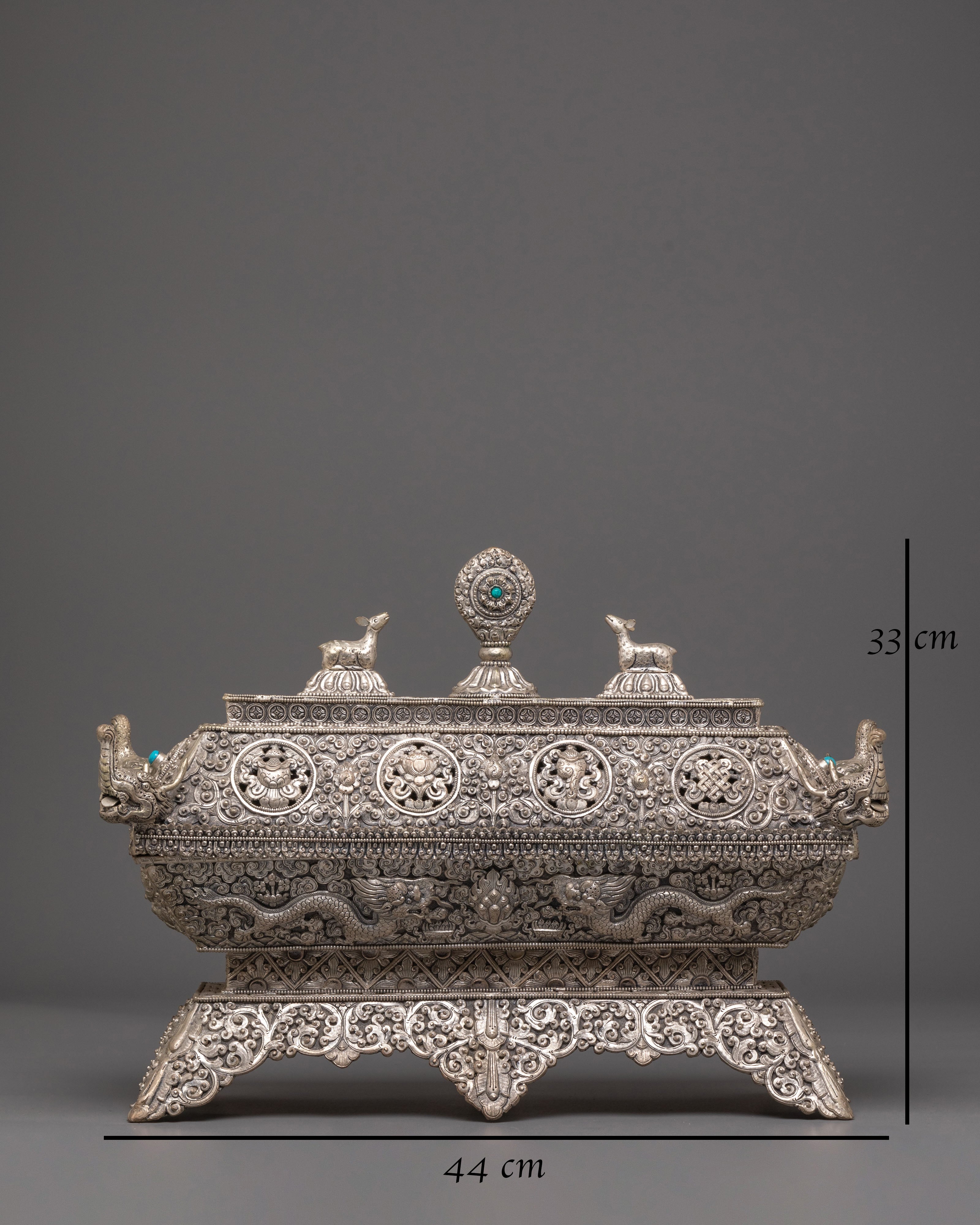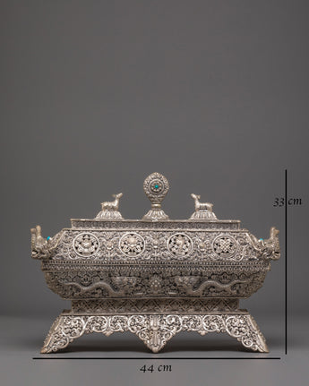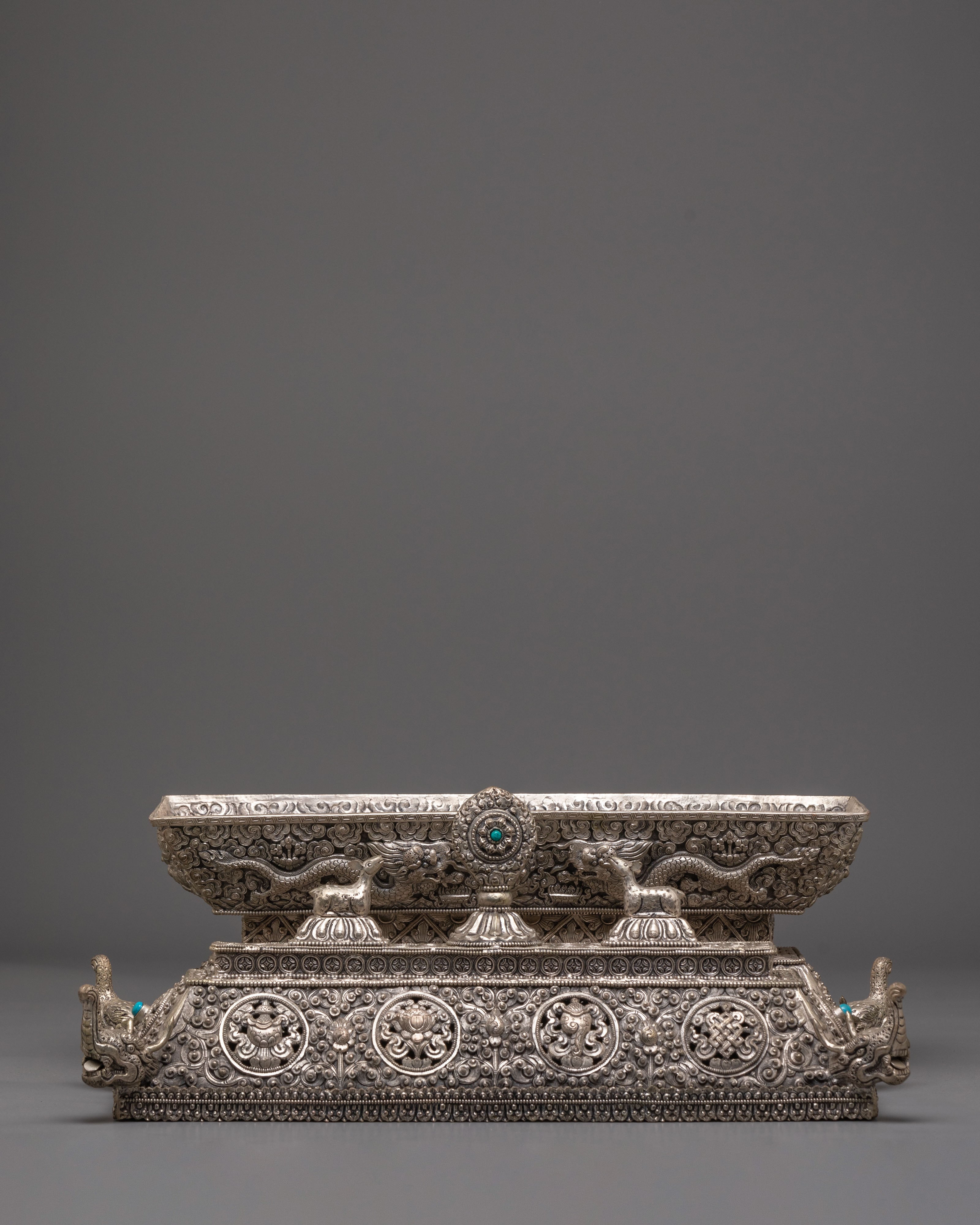 This Tibetan Handcrafted Incense Burner stands at a striking 33 cm in height and boasts a substantial base of 44 cm, providing both a stable foundation and a visually commanding presence. The body of the burner is crafted from copper, known for its rich, warm tone. The copper is beautifully plated with silver, giving it a sophisticated finish that enhances its appeal. This combination of materials not only improves the piece's aesthetic appeal but also reflects the deep spiritual traditions of Tibetan craftsmanship.