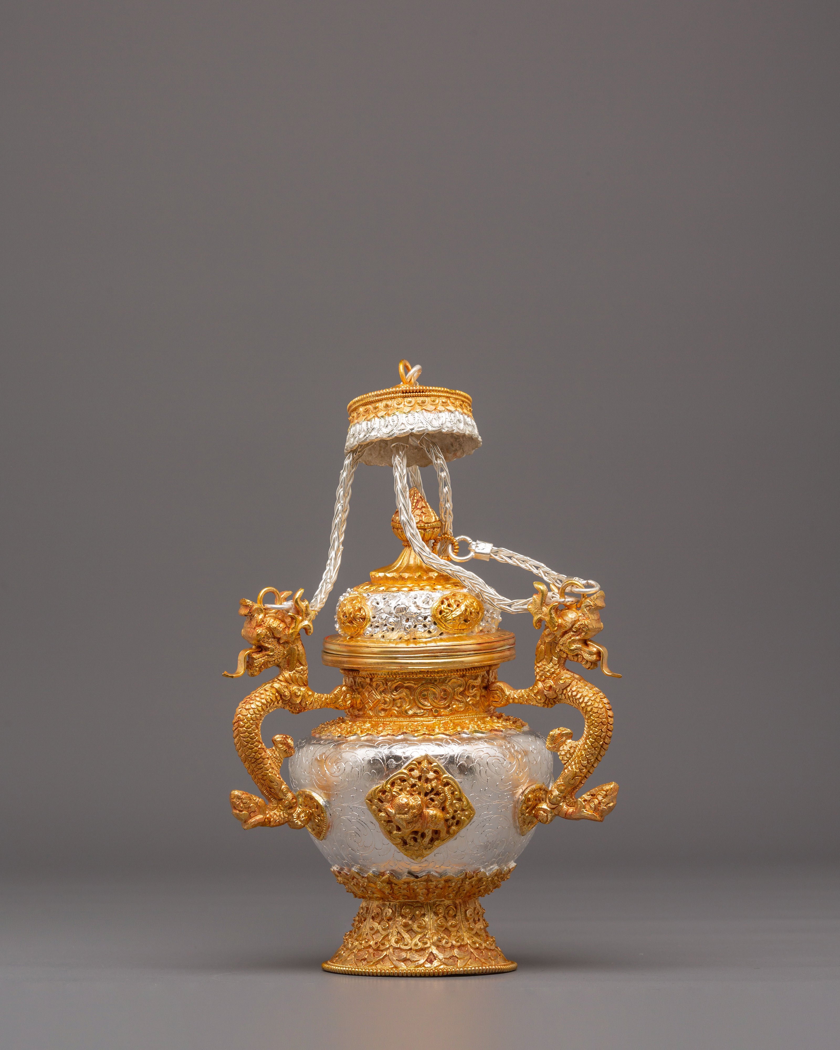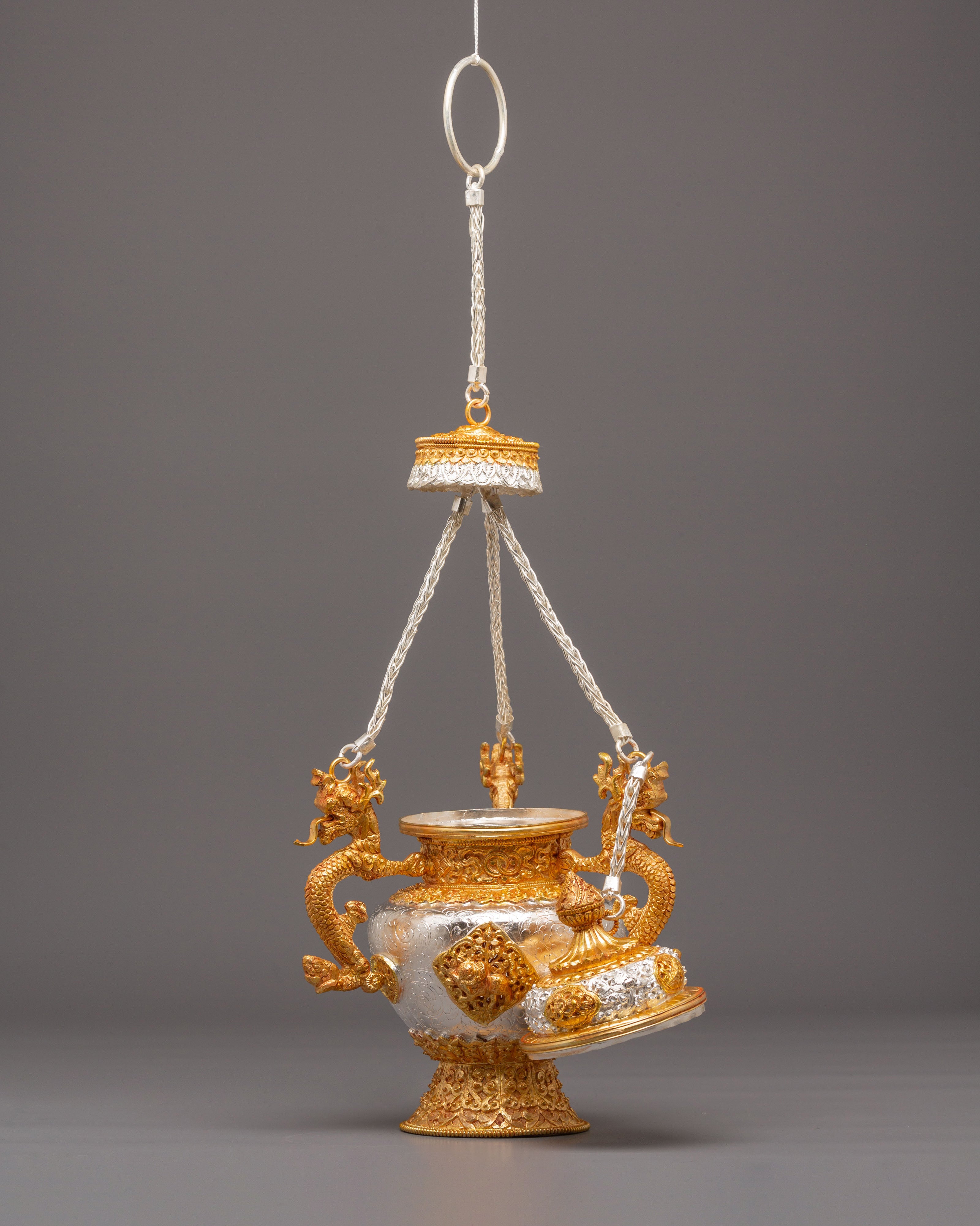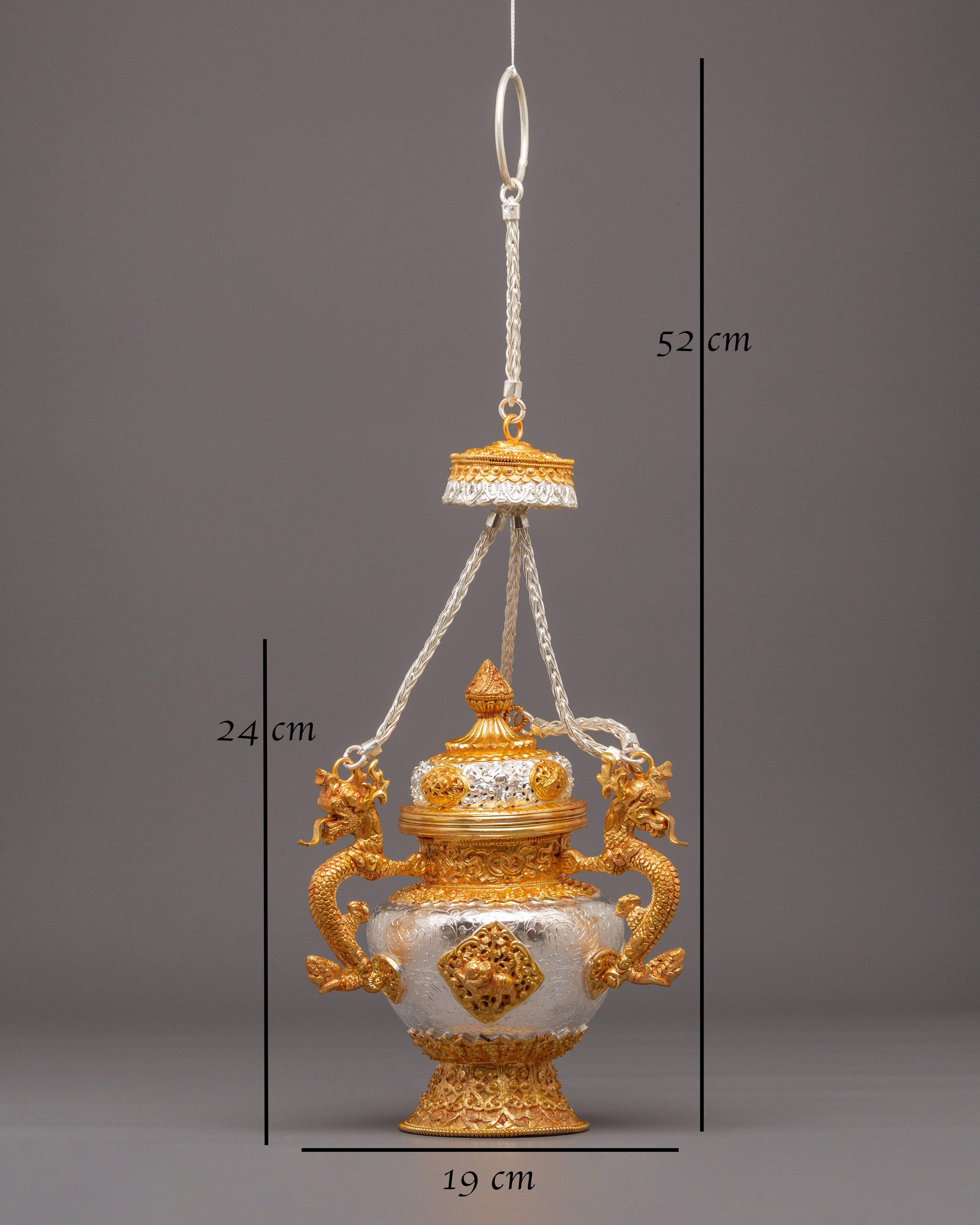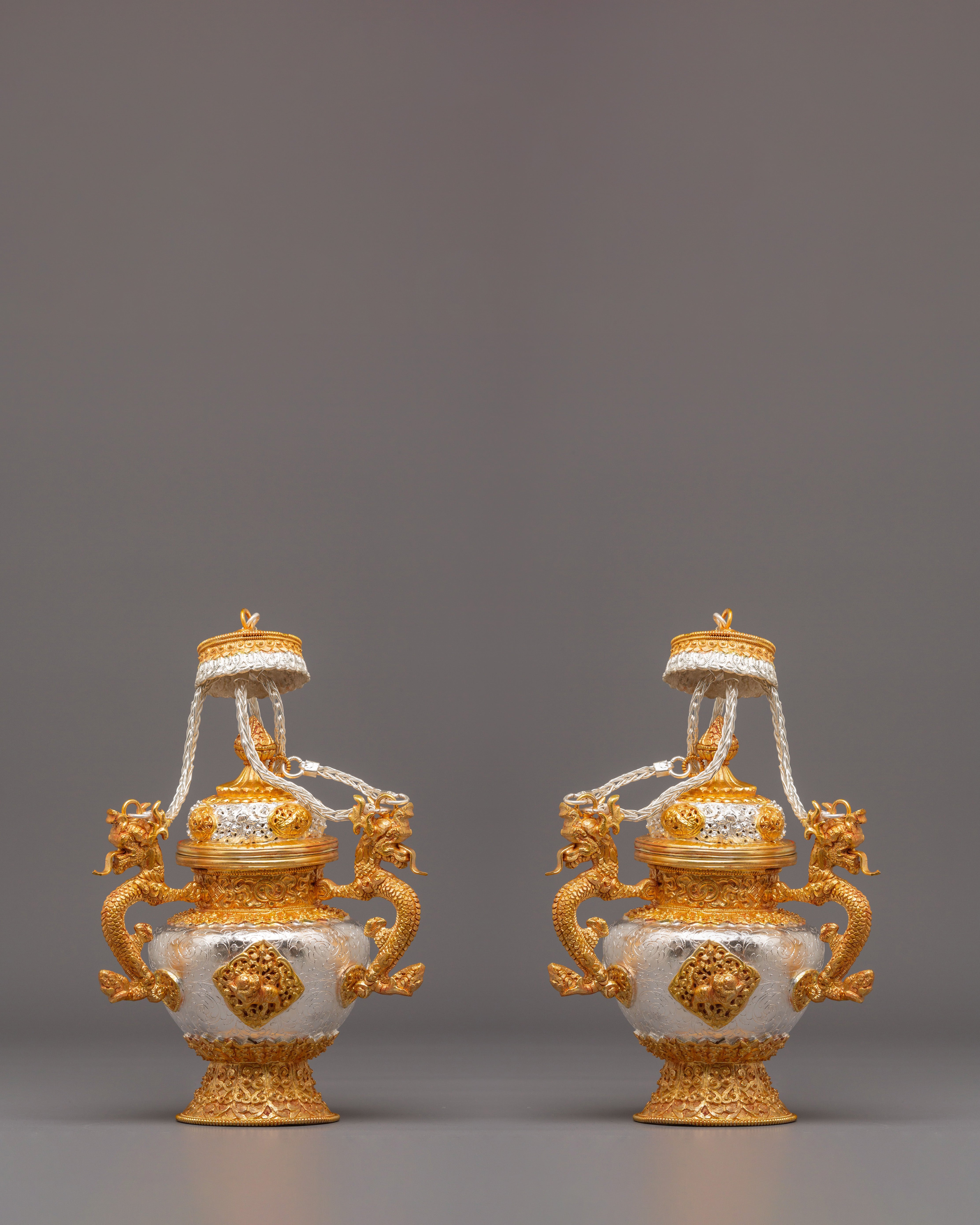 The burners feature exquisite repoussé and filigree work, with intricate patterns that reflect prosperity, protection, and auspicious energy. Each burner is adorned with finely sculpted dragon-shaped handles, symbolizing power, wisdom, and spiritual guardianship. The delicate silver plating highlights the detailed motifs, while the gold plating brings a warm, sacred glow. The braided ornamental strands draping from the top add a ceremonial elegance, enhancing the burners’ visual appeal and cultural authenticity.