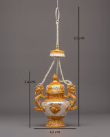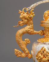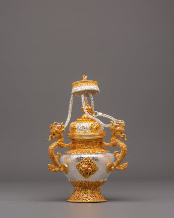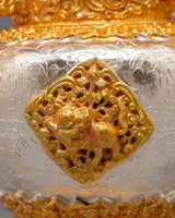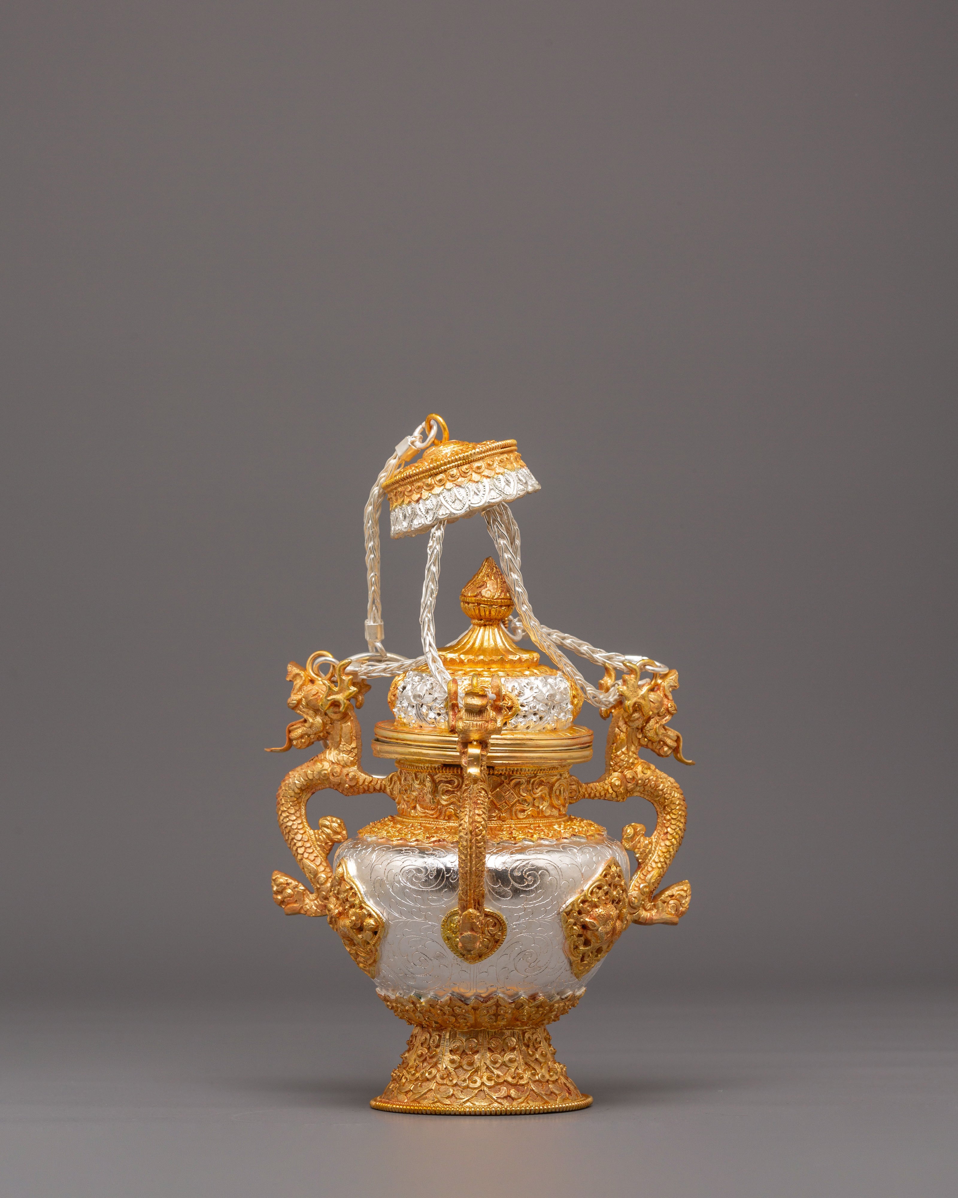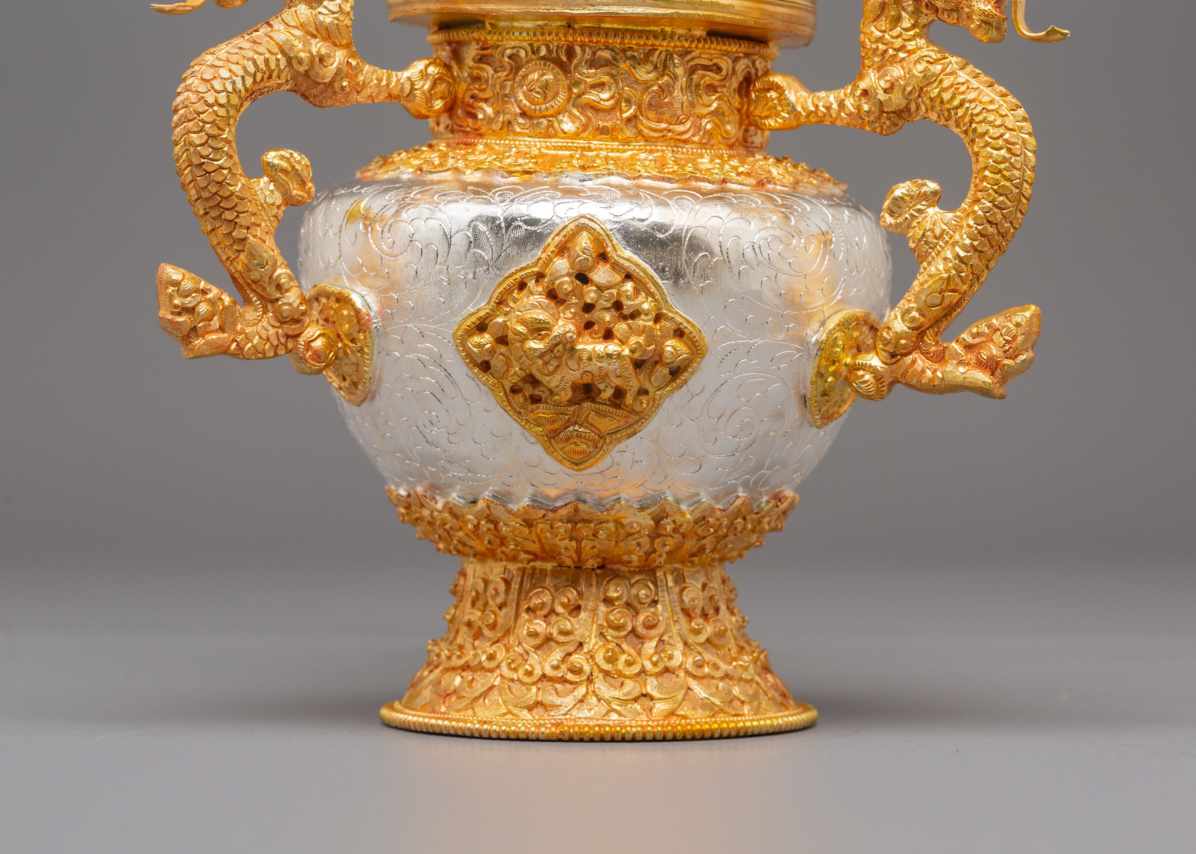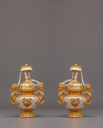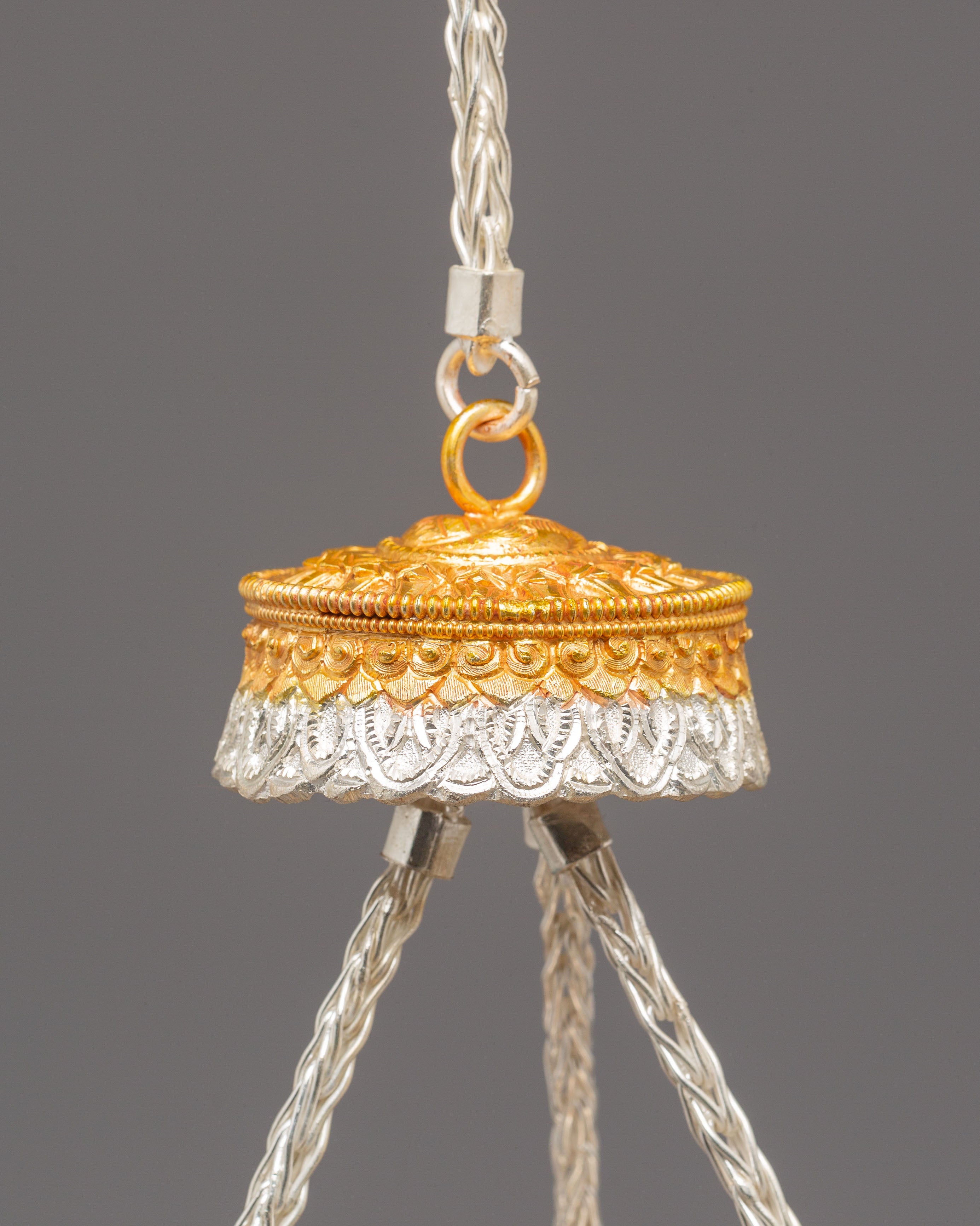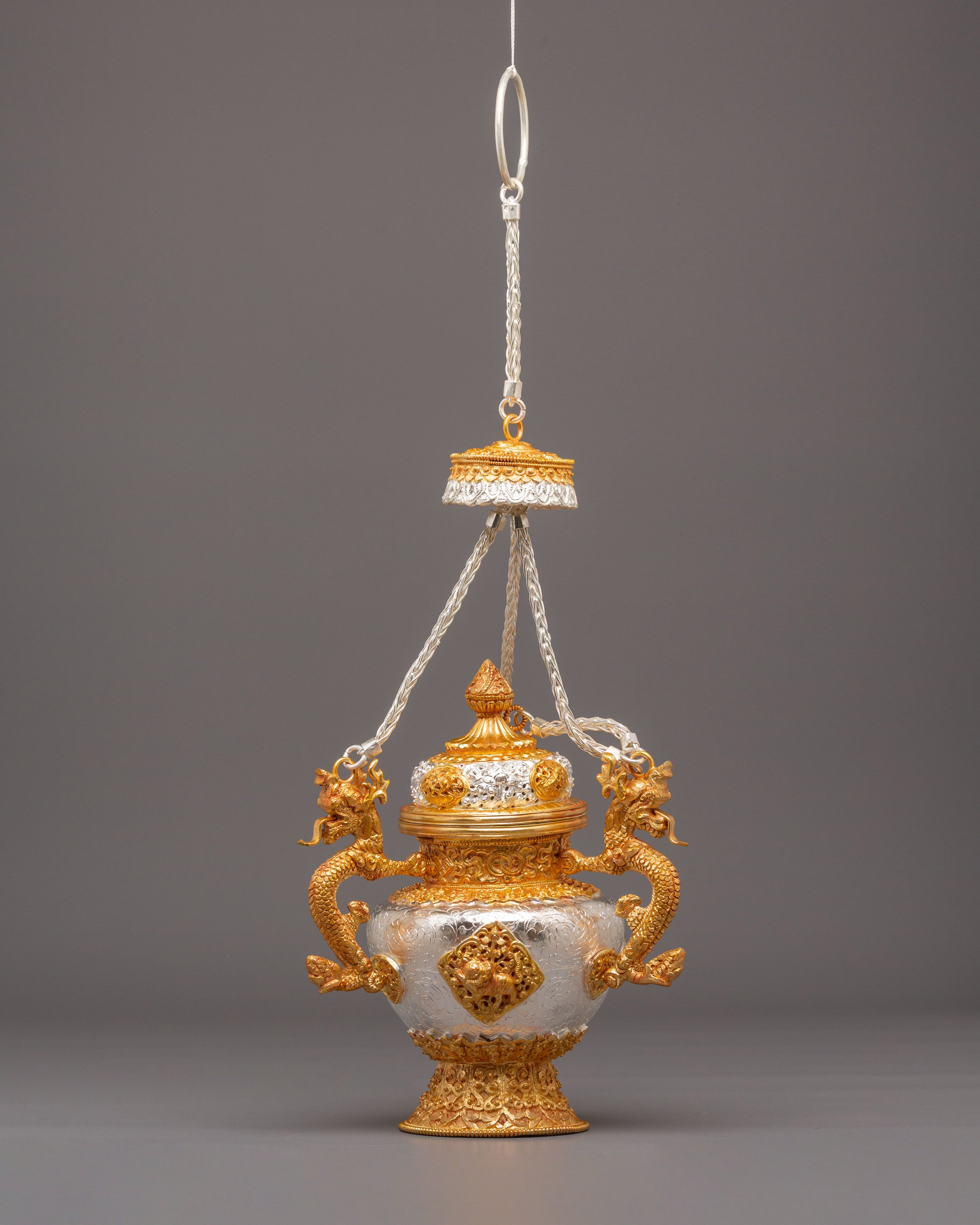 The burners feature exquisite repoussé and filigree work, with intricate patterns that reflect prosperity, protection, and auspicious energy. Each burner is adorned with finely sculpted dragon-shaped handles, symbolizing power, wisdom, and spiritual guardianship. The delicate silver plating highlights the detailed motifs, while the gold plating brings a warm, sacred glow. The braided ornamental strands draping from the top add a ceremonial elegance, enhancing the burners’ visual appeal and cultural authenticity.