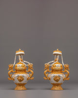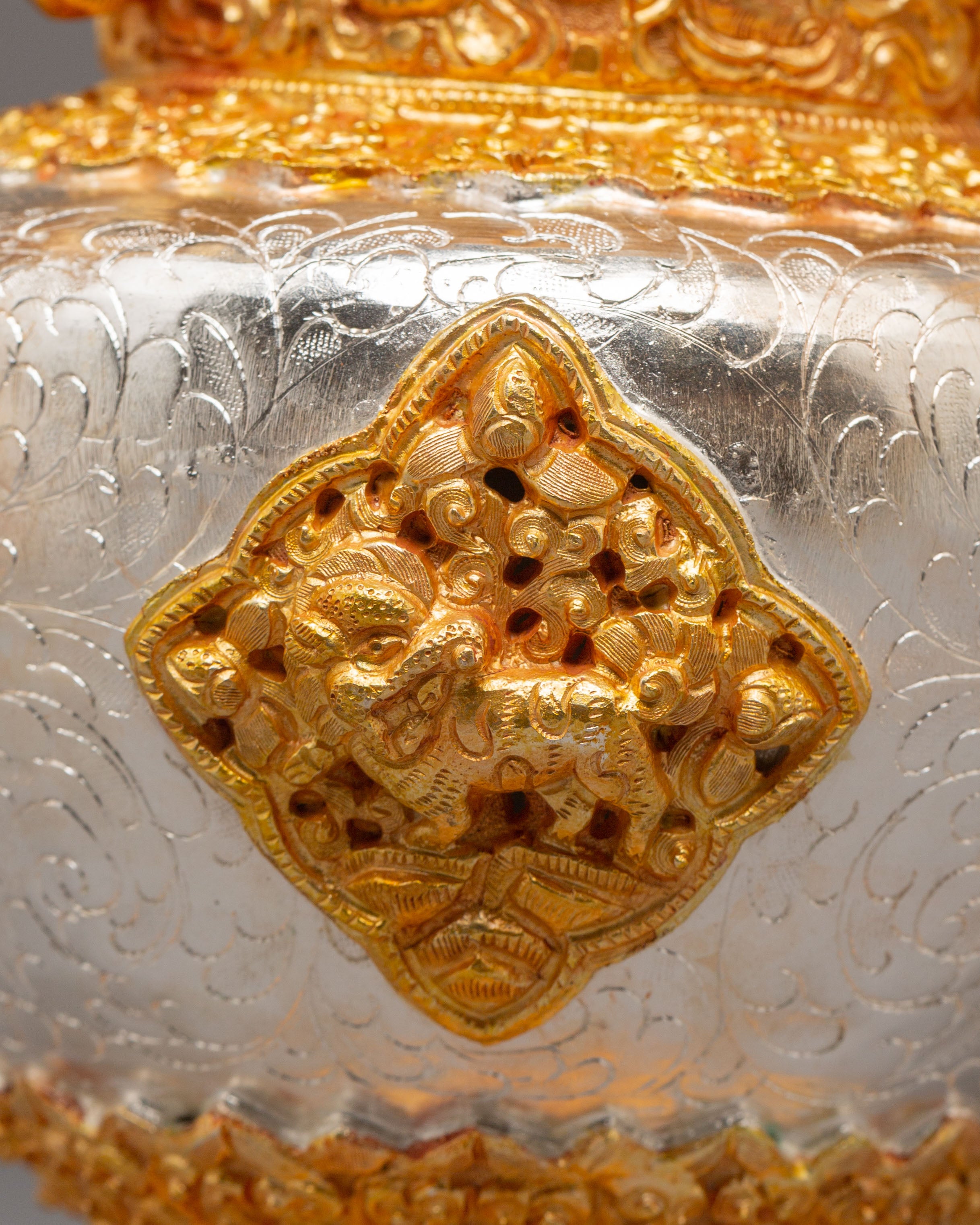 This Tibetan Incense Burner Set is a magnificent pair of ceremonial burners handcrafted with exceptional Himalayan artistry. Each piece measures 24cm in height with a 19cm base, and reaches an overall height of 52cm when fully assembled. Made from a copper body and adorned with electro-gold and electro-silver plating, these burners radiate a divine brilliance that elevates any altar or meditation space. With a single weight of 1.73kg and a total weight of 3.46 kg, they offer a substantial presence.