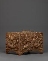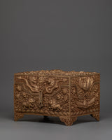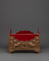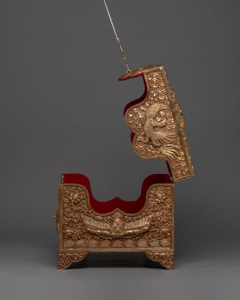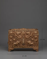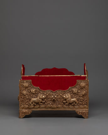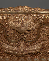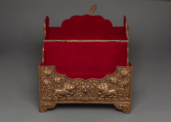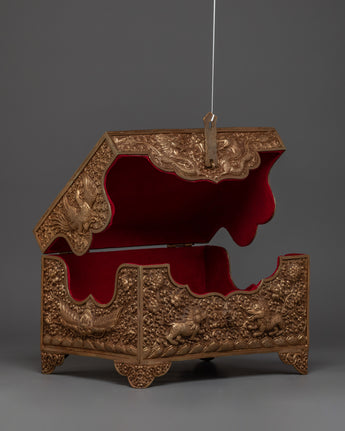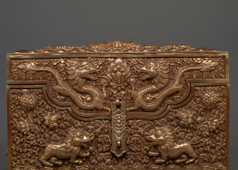 This Copper Treasure Box with Gold Plating is an exquisitely made Tibetan spiritual box that combines beauty, meaning, and use. Standing 22 cm tall and 31 cm wide, this handcrafted altar decor contains exquisite etched designs of Snow Lion Guardians, dragons, birds, and floral patterns. The delicate engravings, together with the brilliant gold plating, make this box a stunning and elegant addition to any spiritual environment. The floral themes and flowers reflect renewal, wealth, and tranquility, while the Snow Lions represent strength and protection, and the dragons represent wisdom, power, and good fortune. This sacred storage chest is ideal for safeguarding your most valuable possessions or storing ritualistic objects used in spiritual rituals.