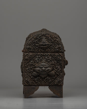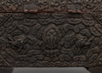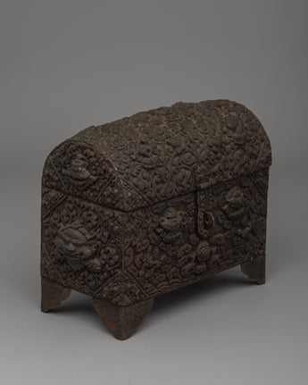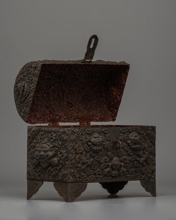 This hand-carved Tibetan treasure box is a gorgeous and useful ritual chest for storing and carrying sacred treasures. These boxes, which have traditionally been used by Tibetan Buddhists, function as shrines for the protection and storage of sanctified goods such as ghaus and other blessed objects. Crafted with rich workmanship, this iron treasure box represents Tibetan culture's spiritual essence while also providing usefulness and aesthetic appeal.