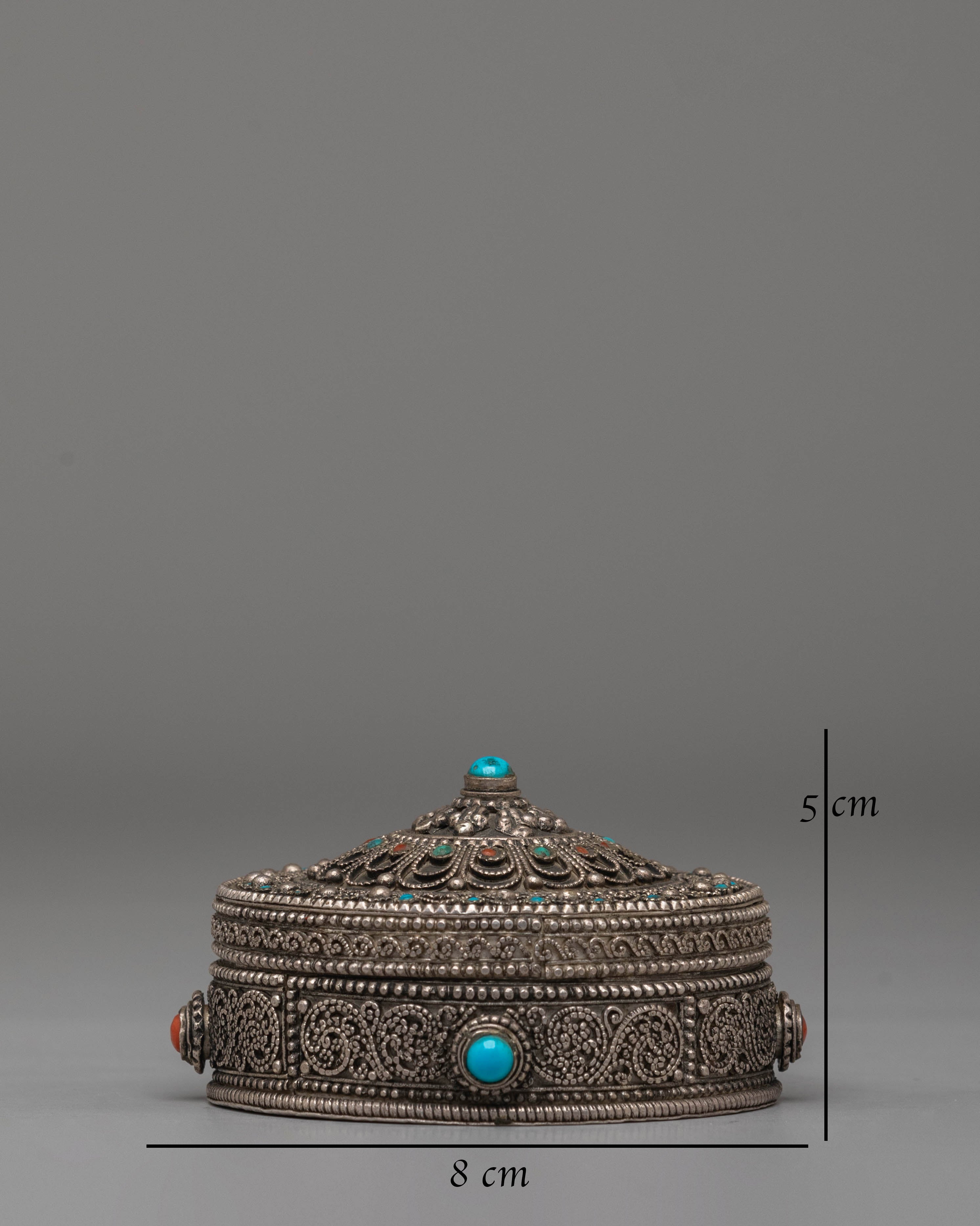 The Handcrafted Jewelry Box is an elegant and practical piece designed to store your precious jewelry in style. Measuring 5cm in height and 8cm in width, and weighing only 0.13kg, this box is crafted from silver and adorned with semi-precious stones, including coral and turquoise. These stones are renowned for their beauty and metaphysical properties, with coral symbolizing vitality and protection, while turquoise is known for its healing and protective qualities. The combination of these elements gives this jewelry box a unique and sacred aura, making it a perfect addition to any collection or as a thoughtful gift.