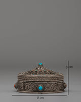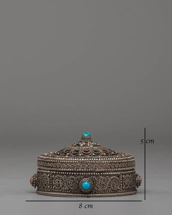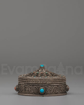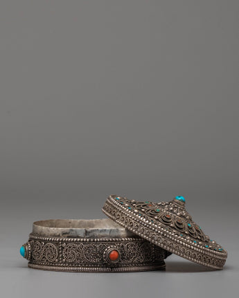 The silver jewelry box is designed with intricate detailing, featuring elegant motifs and the calming colors of coral and turquoise. The semi-precious stones are carefully set into the box, highlighting its beauty and spiritual significance. The box's design is not only aesthetically pleasing but also functional, offering a secure, beautiful place to keep rings, necklaces, or other valuable trinkets. The silver finish gives the box a timeless and sophisticated appearance, making it suitable for both modern and traditional spaces.