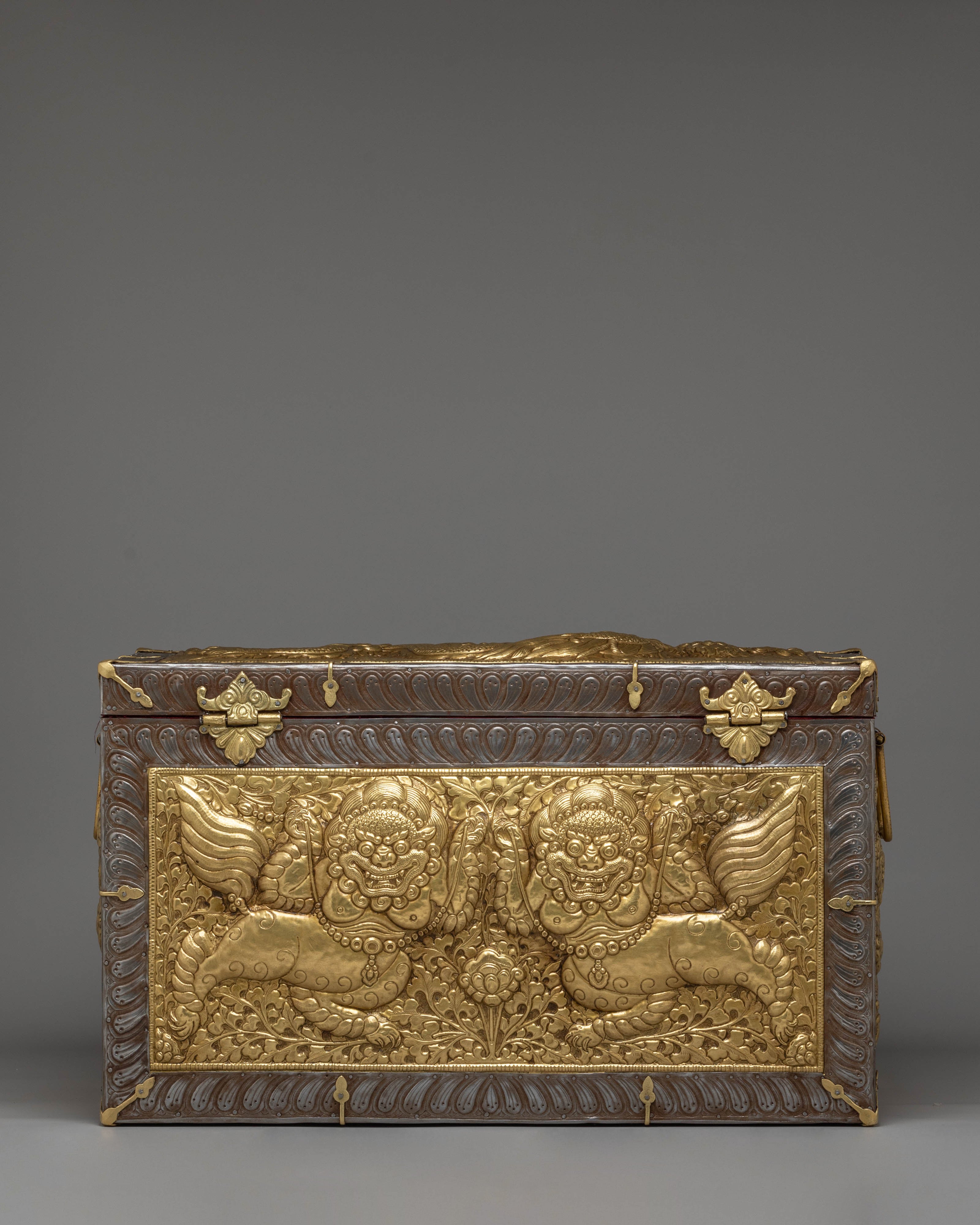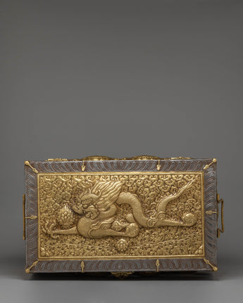 The box's elaborate carvings and patterns showcase the skill and dedication of Tibetan artisans, who have meticulously crafted each detail to honor ancient traditions and spiritual symbolism. The combination of silver and gold plating adds a luxurious touch, enhancing the box's aesthetic appeal and symbolic value. Whether used to store ritual objects, sacred texts, or personal treasures, this Tibetan treasure box will serve as a powerful reminder of your spiritual journey and connection to the divine.