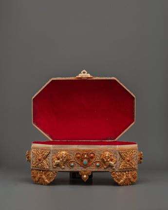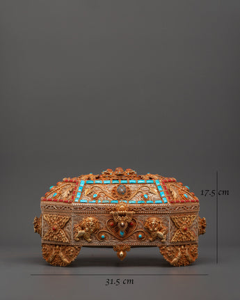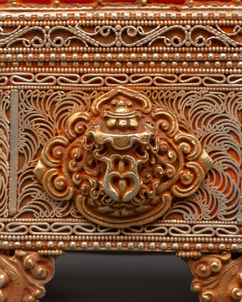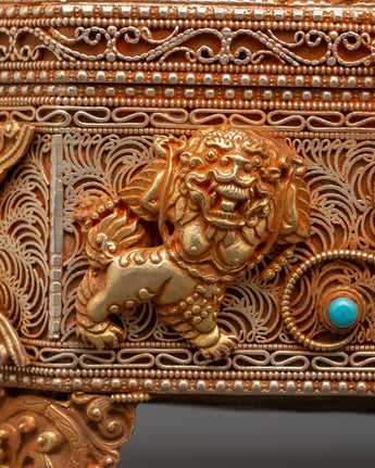 Every box surface is embellished with elaborate filigree work—delicate metal threads twisted and attached into stunning floral and geometric designs. The top highlighted gemstone borders are turquoise and coral, representing wisdom, healing, and spiritual protection. Four lion heads adorn the base, indicating strength and security, while decorated legs elevate the piece like a sacred altar. This treasure box is more than a helpful item; it's a powerful decorative element coated with cultural significance and spiritual force.