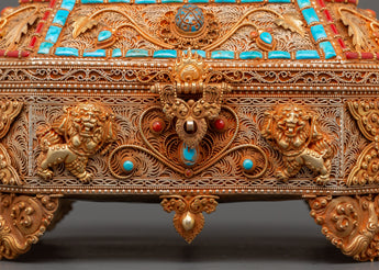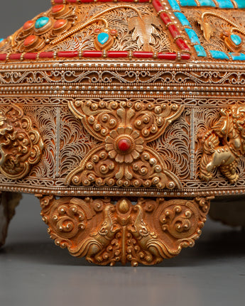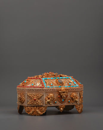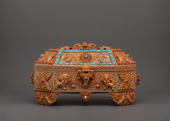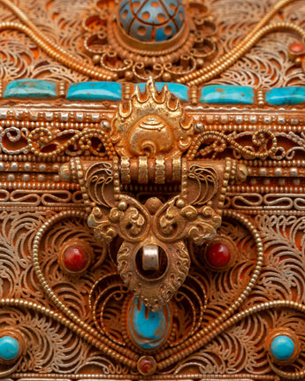 This elegant Himalayan Box with Filigree Work is an incredible representation of Himalayan sacred art, mixing spiritual symbolism with artisan skill. It is created from a copper body, beautifully coated in gold and silver, and embellished with Original turquoise and coral stones. This box, traditionally used to store precious goods like relics, writings, or ritual implements, symbolizes protection and adoration.