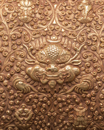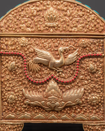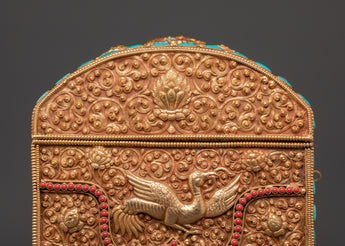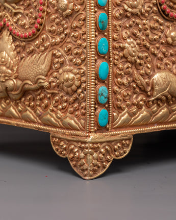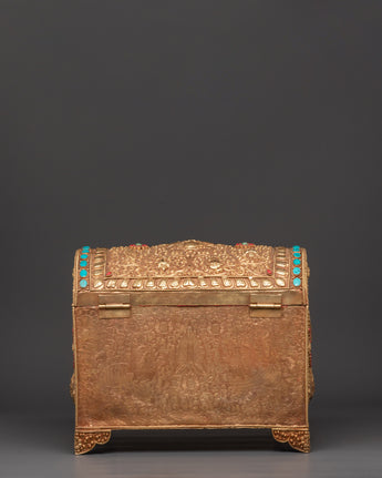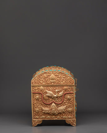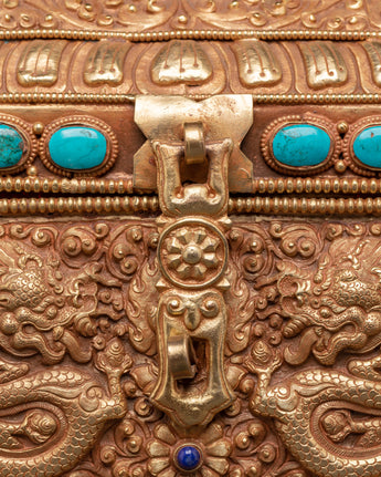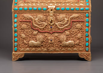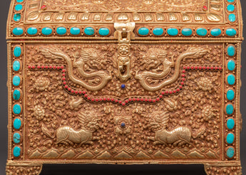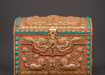 The chest's Tibetan artistry is evident in every aspect, from the delicate patterns engraved into the copper surface to the gorgeous artificial stones put inside the box. Turquoise stones, combined with red coral inlays, exude richness and tranquility and are frequently used in Eastern cultures to represent protection and good fortune. This colorful storage box, weighing 4.81 kg, is more than just a useful item; it's also a work of art that recounts the story of prehistoric traditions. Whether for personal use or as a thoughtful present, it's a wonderful work of artistry.