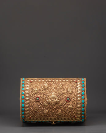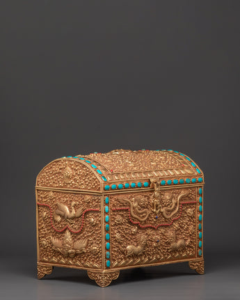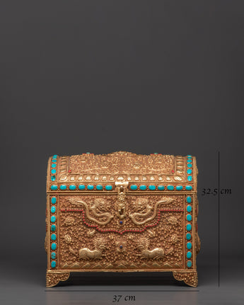 Indulge in luxury with this exquisitely built Luxury Storage Chest, which will boost your decor. This treasure chest, measuring 32.5 cm in height, 37 cm in breadth, and 24.5 cm in depth, provides ample space for storing valuable objects while also serving as a visually appealing centerpiece. Its exquisite design, with a rich combination of a copper body, gold plating, and brilliant turquoise inlays, provides an ideal balance of elegance and utility. This chest, perfect for displaying on a shelf, desk, or as part of an antique-style collection, stands out for its distinct artistic flair and rich cultural impact.
