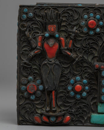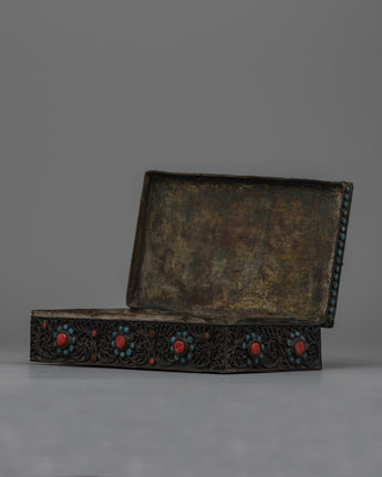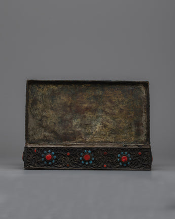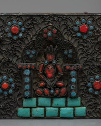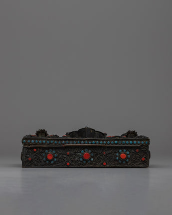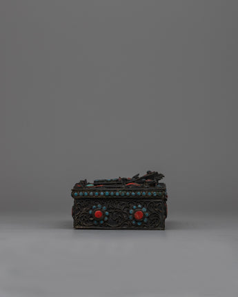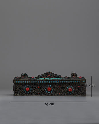 This Traditional Tibetan Buddhist Jewelry Box is more than just a storage container; it is a spiritual vessel created to house your most precious memories. Handcrafted from brass and inlaid with artificial coral and turquoise, this beautiful jewelry box adds a spiritual touch to your collection. Its sacred Buddhist design converts this piece into a protection and positive energy symbol, giving it an ideal home for your precious jewelry.