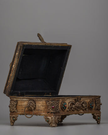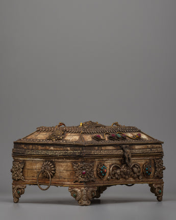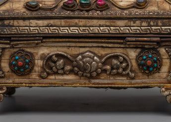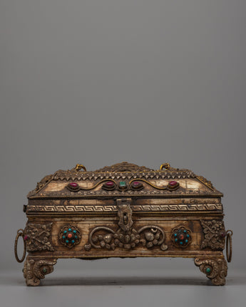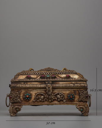 This treasure box, which measures 16.5 cm tall, 30 cm wide, and weighs 2.68 kg, is strong and finely designed, making it ideal for holding ghaus or other sacred goods. Its exquisite form, accented with bright faux stones, makes it a striking centerpiece for your Buddhist altar or home decor. Place this box in the center of an uncluttered altar space and cover it with a meaningful fabric to create a peaceful shrine. Its ageless craftsmanship and spiritual significance make it a wonderful choice for both practitioners and collectors.
