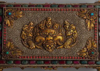 Discover the elegance and spiritual tradition of this handcrafted Tibetan Treasure Box with Silver Wire, which combines craftsmanship and cultural significance. This wooden chest is silver and gold-plated and meticulously decorated with delicate silver wire decorations, which give elegance to its complex appearance. This treasure box, adorned with brilliant turquoise and coral stones, is ideal for keeping jewelry, religious relics, or serving as an eye-catching centerpiece for your altar. With dimensions of 16.5 cm in height and 30 cm in breadth, and a weight of 2.68 kg, it combines elegance and effectiveness.