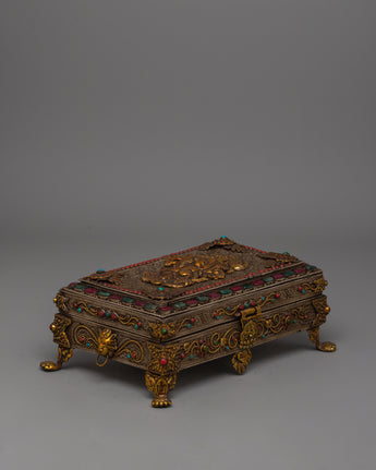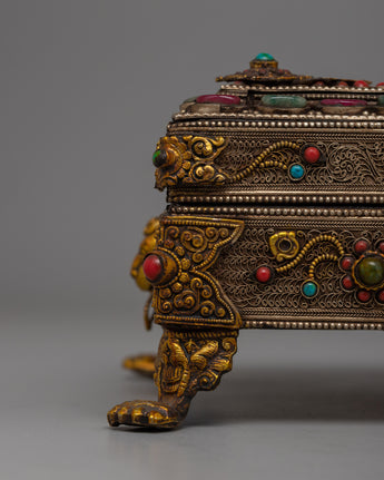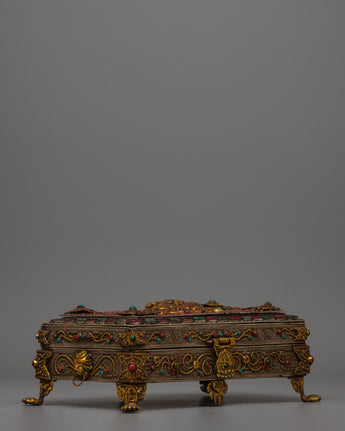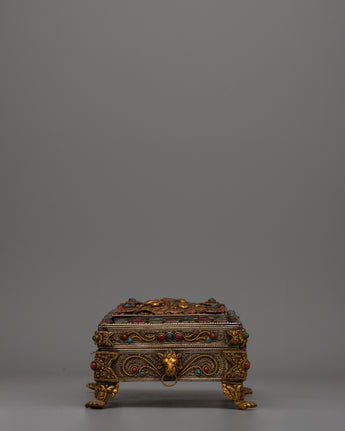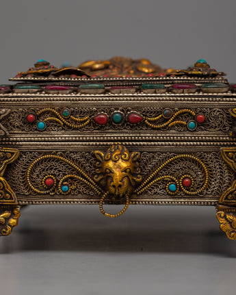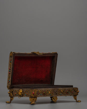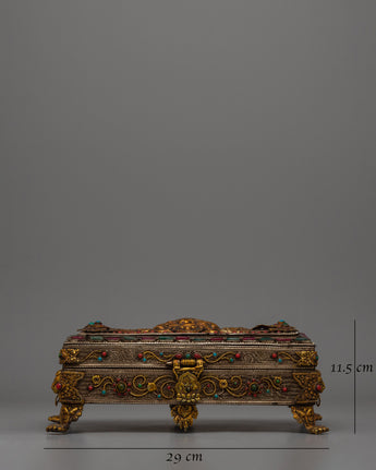 The intricate carvings, symbolic designs, and use of silver wire demonstrate traditional Tibetan workmanship and attention to detail. This chest, with its graceful legs, combines both strength and elegance. It is more than a jewelry box; it is an artwork element representing prosperity and spirituality. This treasure box, whether utilized for useful storage or decorative purposes, is a timeless addition to any home or sacred space. A great present for collectors or anyone looking for individual handcrafted items.