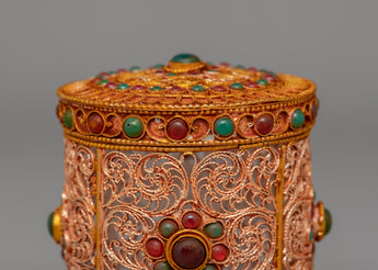 The precise positioning of turquoise, panna, and ruby stones adds to the treasure box's aesthetic appeal. The jewels are positioned symmetrically, complementing the fine metalwork to produce a balanced and elegant look. The center of the box has a big spherical stone that serves as the focal point, while smaller gemstones are uniformly placed across its surface, providing brightness and spiritual meaning. The lid is likewise embellished with a central jewel, ensuring design consistency and beauty.