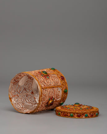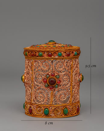 This filigree jewelry box is compact, measuring 9.5 cm in height and 8 cm in width, yet it has enough space to store small valuables, religious artifacts, or cherished trinkets.