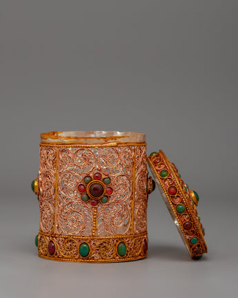 This gorgeous traditional treasure box is a work of art, blending filigree art with the meticulous placing of artificial stones to create a genuinely exceptional decorative piece. This box's complex workmanship, made of copper and silver-plated, demonstrates the artists' expertise and precision. The filigree ornamentation comprises tiny, lace-like patterns carved into the body, resulting in swirling designs that provide depth and refinement to the overall design. These decorative designs give it an appearance of history and grandeur, elevating it above a storage box and into a piece of heritage.
