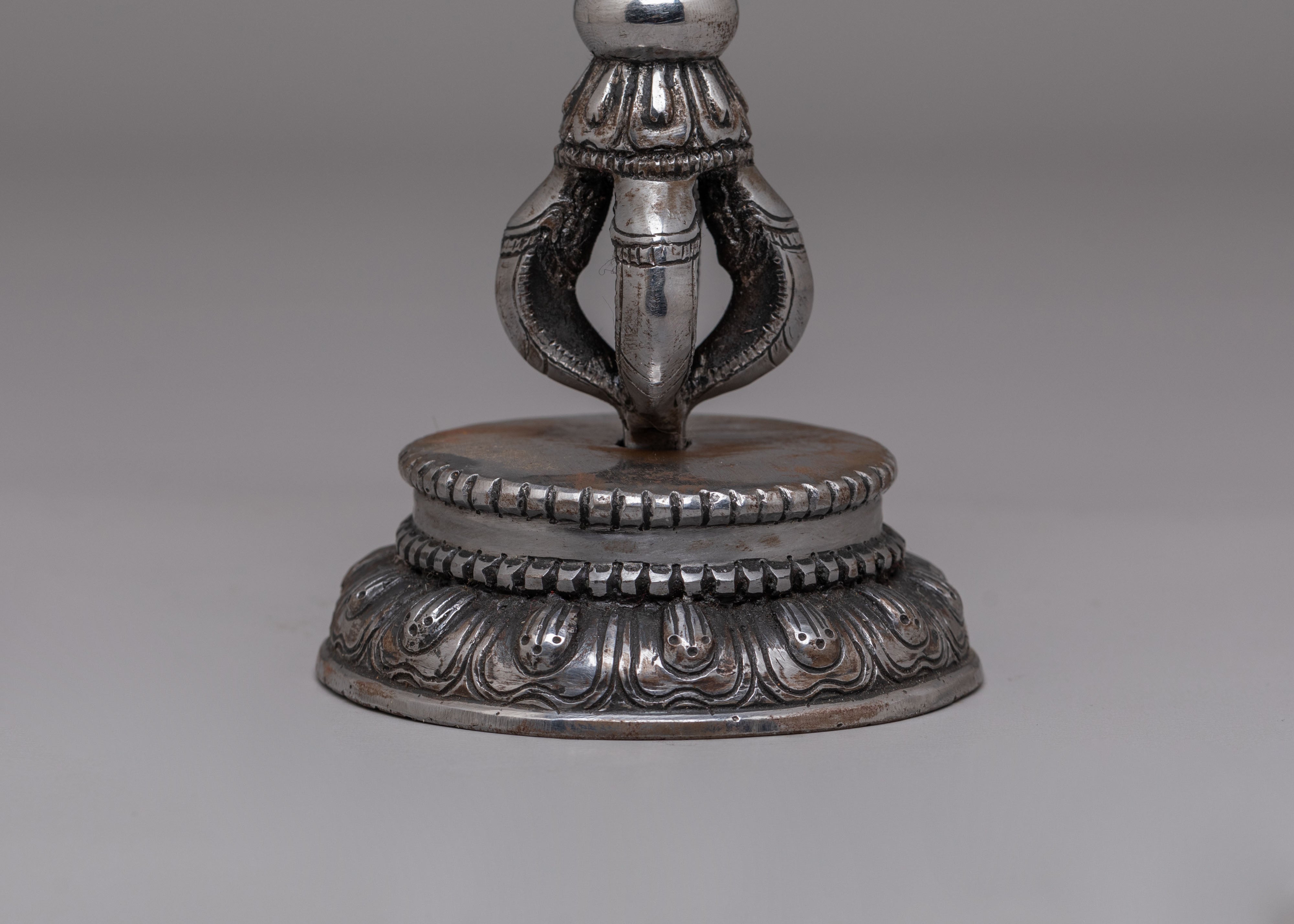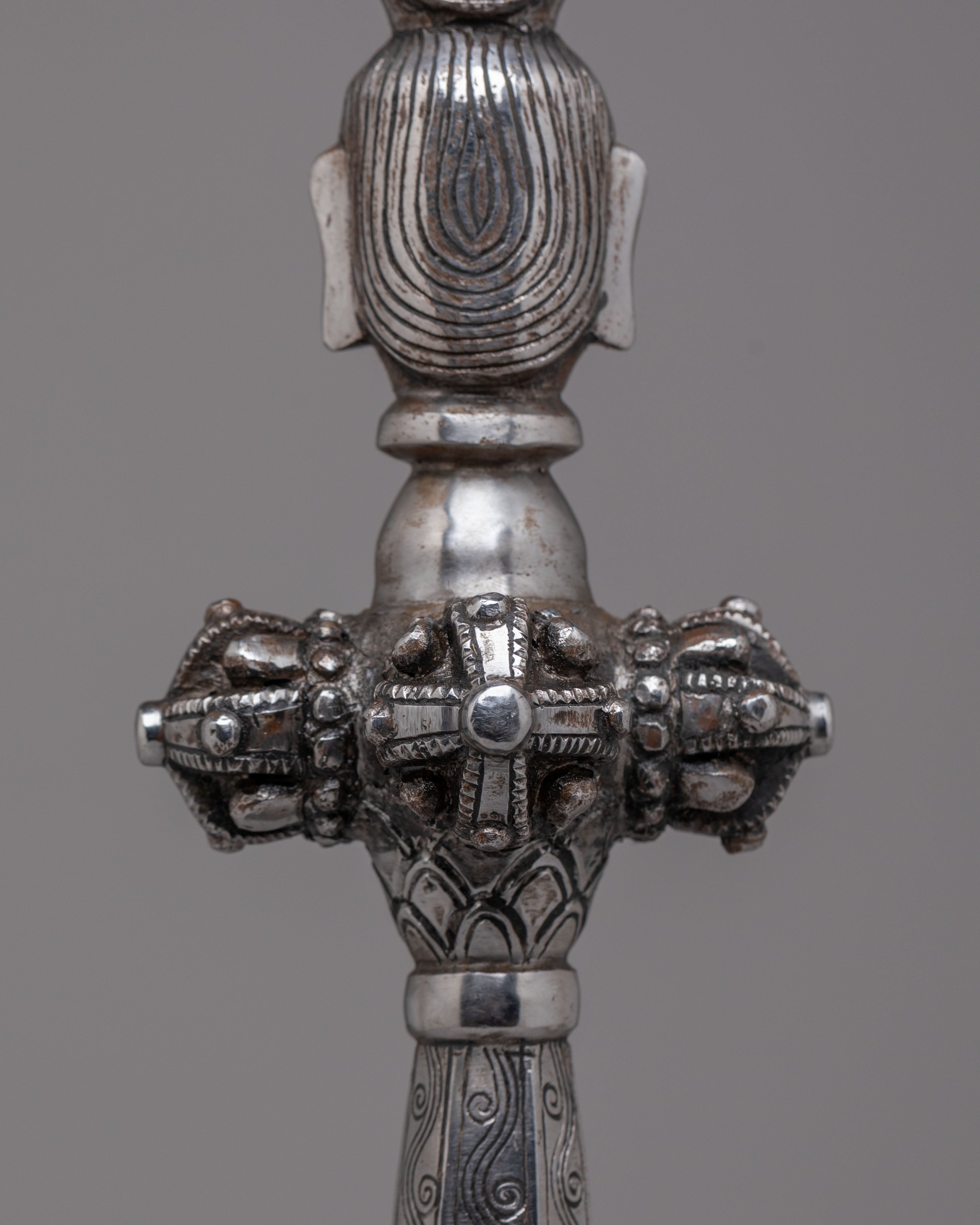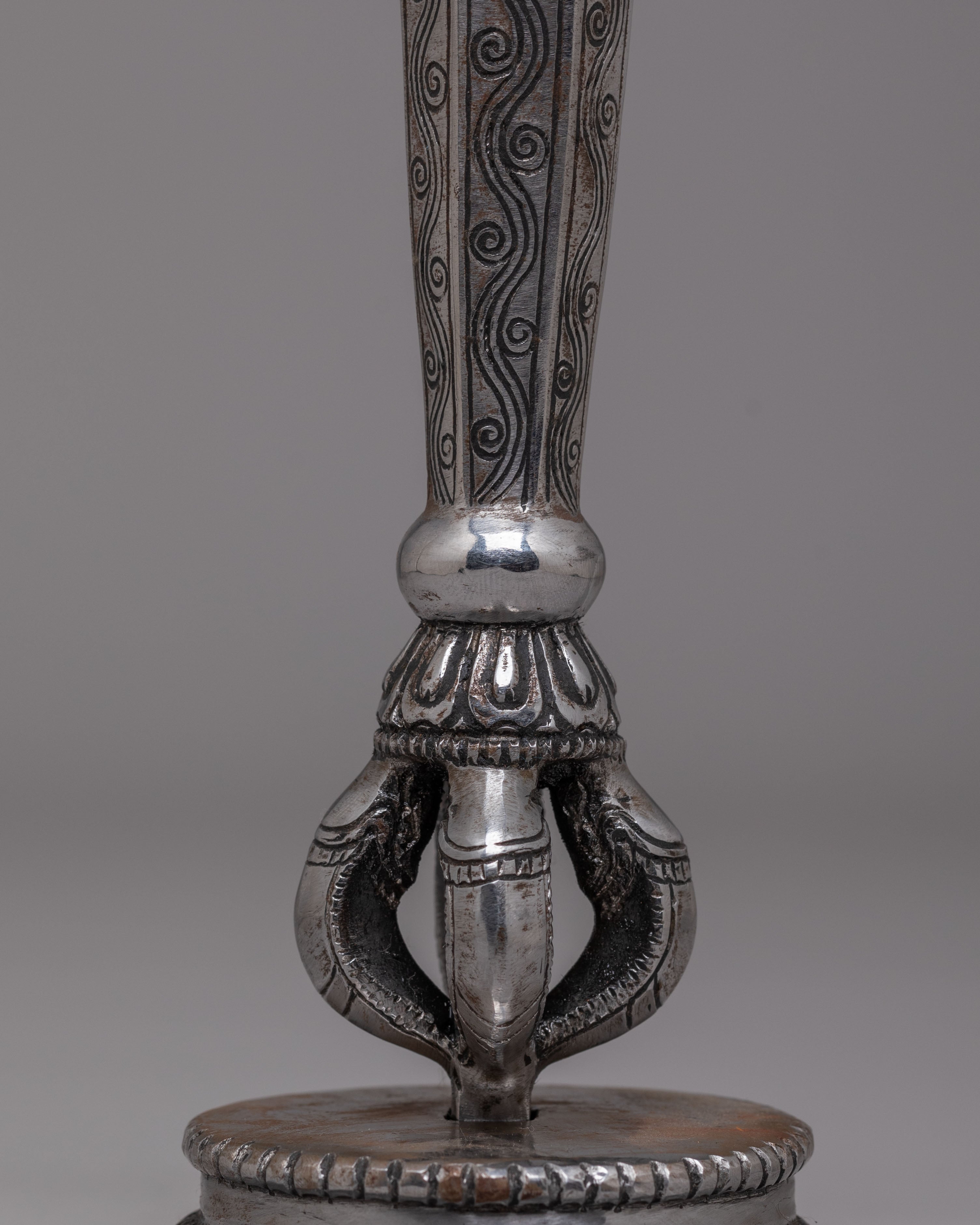 Made entirely from iron, this Tibetan Khatvanga features a detailed shaft with sacred symbols and motifs that reflect the deep teachings of Tibetan Buddhism. The tool’s iron construction represents strength and transformation, while its shape—a combination of a dagger and staff—symbolizes the union of wisdom and compassion. The khatvanga is often used in tantric rituals to invoke deities, protect from negative influences, and aid in spiritual growth. Its spiritual significance and connection to Tibetan practices make it a powerful tool for practitioners.