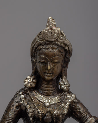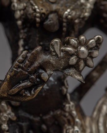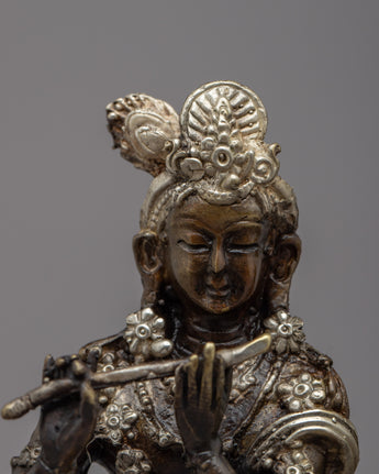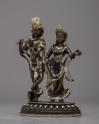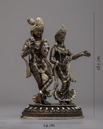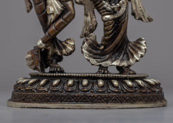 Admire the beautiful Radha Krishna Statue, a work of art and devotion in itself. The divine love and unbreakable bond between Radha and Krishna are beautifully displayed in this exquisite work of art, which is carefully handcrafted on a brass body. Their divine forms' intricate details are captured with the utmost care and accuracy, exuding grace and tranquility. This statue's silver plating enhances its enduring beauty and gives it a celestial aura. Radha and Krishna's divine presence bathes the area in love, harmony, and spiritual bliss as they stand atop the lotus base. Enjoy the alluring charm of this statue of Radha and Krishna, which represents divine love and devotion.