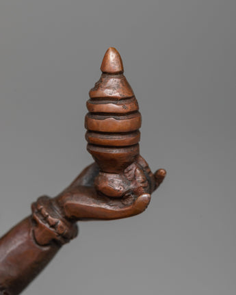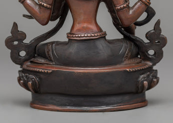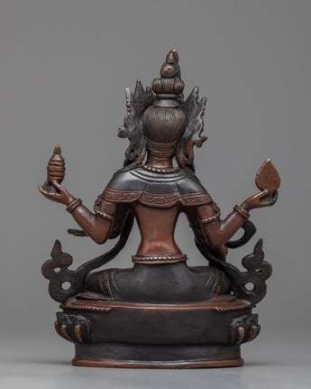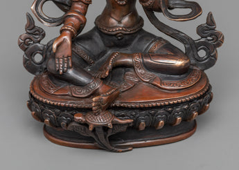 The statue is expertly constructed with an oxidized copper body for a traditional and revered appearance. The oxidization process gives the copper a rich, deep tone, emphasizing the delicate workmanship and traditional dress of Devi Laxmi. This material choice not only honors traditional Hindu creativity but also ensures the statue's longevity and ageless beauty.