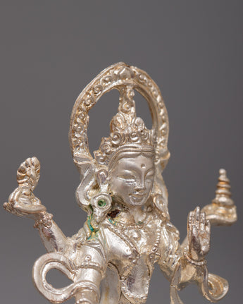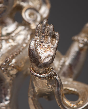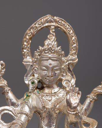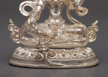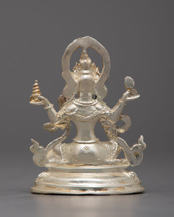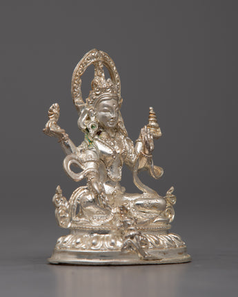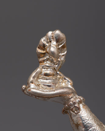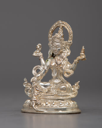 The goddess of prosperity, Laxmi Devi, is depicted in this exquisite statue, which is machine-made with great care on a copper body and finished with a shimmering silver plating. Standing just 10 cm tall, this little statue is ideal for personal altars or as a lucky accent piece in your house or place of business. The silver plating enhances its beauty, dazzlingly reflecting light and giving any area a hint of magnificent sheen.