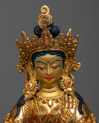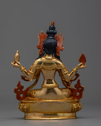 The statue is made of a copper body and then gilded in genuine 24k gold. She is depicted sitting atop a lotus with her right leg stretched and left leg drawn in. She has 4 arms, 1 face. She wears a beautifully hand-carved crown and silk garment flowing around her.