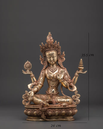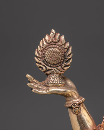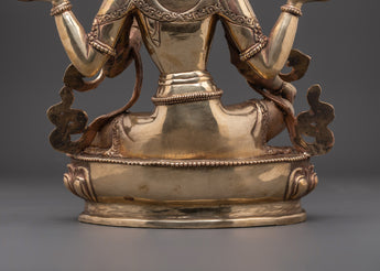 Goddess Laxmi is frequently depicted with four hands, each representing an essential aspect of her divine gifts: spiritual fulfillment, material wealth, beauty, and prosperity. This statue's exquisite copper craftsmanship and serene pose bring a relaxing, prosperous atmosphere into your space. Whether used in ceremonies or simply as a decorative centerpiece, the statue is a potent symbol of divine favor and prosperity.