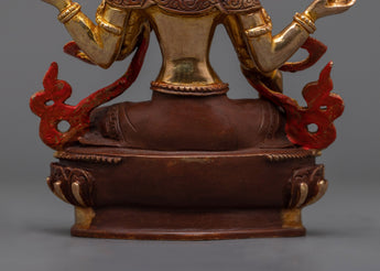 Presenting the Laxmi Sculpture: a representation of the Hindu goddess of wealth, prosperity, good fortune, and beauty, Laxmi. At a mere 6.6 inches in height and 4.9 inches at the base, with a weight of 0.89 kg, this sculpture embodies Goddess Laxmi's tranquil elegance and abundant presence. This piece, made of an oxidized copper body with 24K gold plating for timeless elegance, is further enhanced by intricate paintings in gold and acrylic that represent the goddess' unbounded generosity and the abundance she bestows upon her devotees.