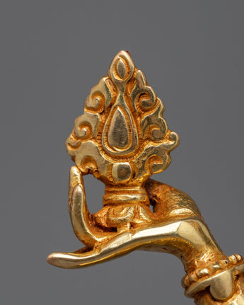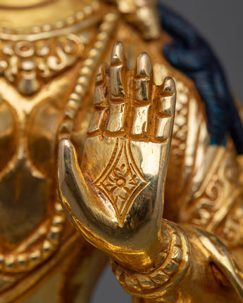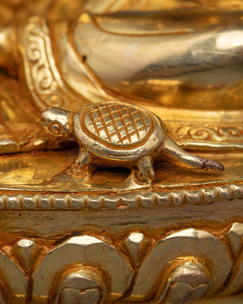 This statue is expertly carved from copper and elegantly gilded in 24K gold, reflecting the goddess's celestial character. The delicate intricacies of Laxmi's dress, her kind demeanor, and the traditional symbols she carries, such as the lotus flower and jug of gold, are brought to life in the gold and acrylic paintings. Every detail of this sculpture is intended to depict her function as a bringer of riches and prosperity.