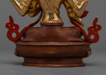 Presenting the Ma Laxmi Statue: a celestial incarnation of Laxmi, the Hindu goddess of riches, prosperity, grandeur, beauty, fertility, and good fortune. This statue, which stands at a lovely height of 9 inches on a base of 6.6 inches and weighs 1.96 kg, embodies Ma Laxmi's giving and caring nature to the fullest. This statue, which represents the goddess' limitless elegance and the prosperity she bestows upon her devotees, is further enhanced with detailed gold and acrylic paintings. It is crafted from an oxidized copper body and adorned with 24K gold plating for a distinguished and timeless appearance.
