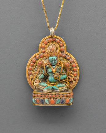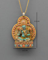 The Buddhist Healing Ghau Box Pendant is an exquisite piece of spiritual jewelry that carries the essence of healing, protection, and positive energy. Crafted from a copper body with gold plating, this pendant measures 6.5 cm tall and 4.5 cm wide, creating a timeless piece of art. The design features a traditional Ghau box, a sacred object in Tibetan Buddhism used for carrying relics and prayers. The box is intricately adorned with artificial stones, including Turquoise, Coral, and Lapis Lazuli, each selected for its healing and protective qualities.