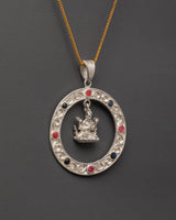 This sacred locket captures the essence of Buddhist spirituality through its thoughtfully composed imagery. A meditative master adorned with a crown symbolizes the pinnacle of spiritual achievement and enlightened authority. Delicate filigree detailing frames the figure with refined artistry, while protective coral stones energize the piece's outer edge. The locket's circular form embodies Buddhism's profound teachings on life's eternal cycle and the transformative path to awakening. Wear this meaningful talisman as a daily reminder of your spiritual aspirations and the boundless potential within your journey toward inner peace and enlightenment.