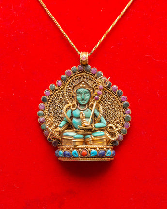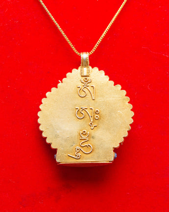 The Guru Rinpoche locket's exquisite design includes a finely carved figure of Guru Rinpoche in a peaceful and serene position, holding the Vajra (power symbol) and lotus flower (purity symbol). The surrounding gemstones symbolize the harmonious combination of wisdom and compassion, as well as the transformative force of Guru Rinpoche's blessings. The lapis lazuli represents wisdom and insight, the ruby provides vigor and protection, the panna promotes spiritual clarity, and the coral increases strength and healing energy.