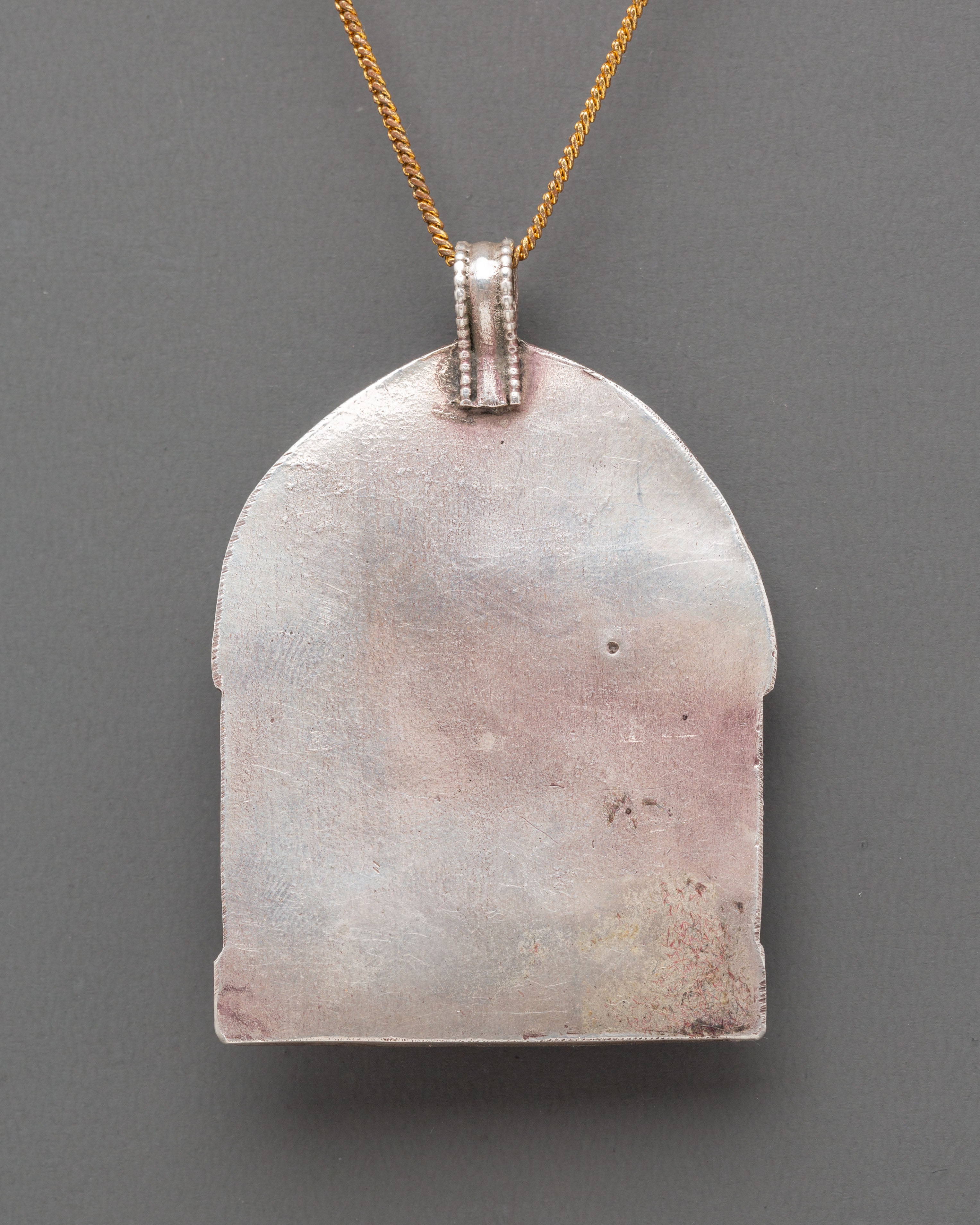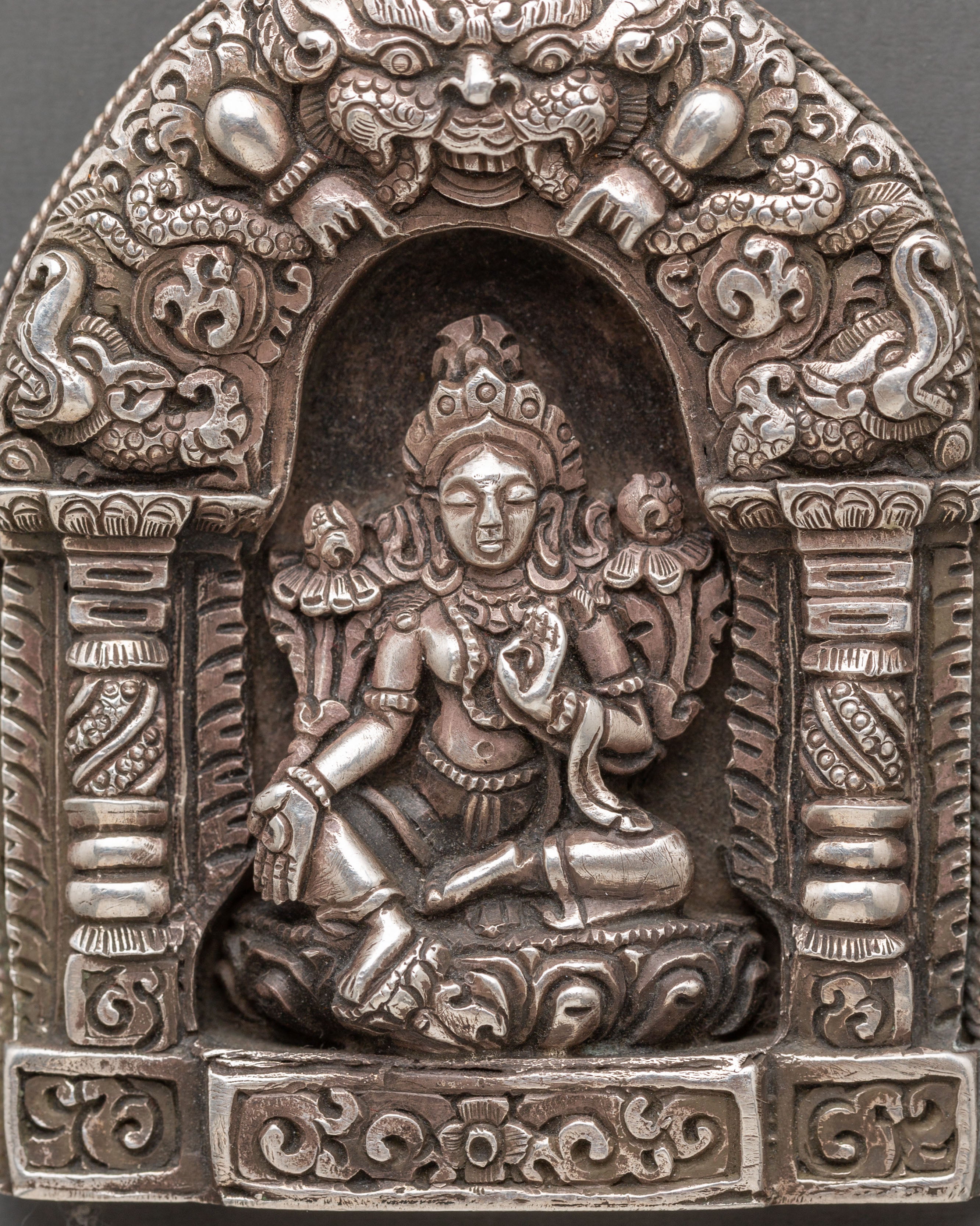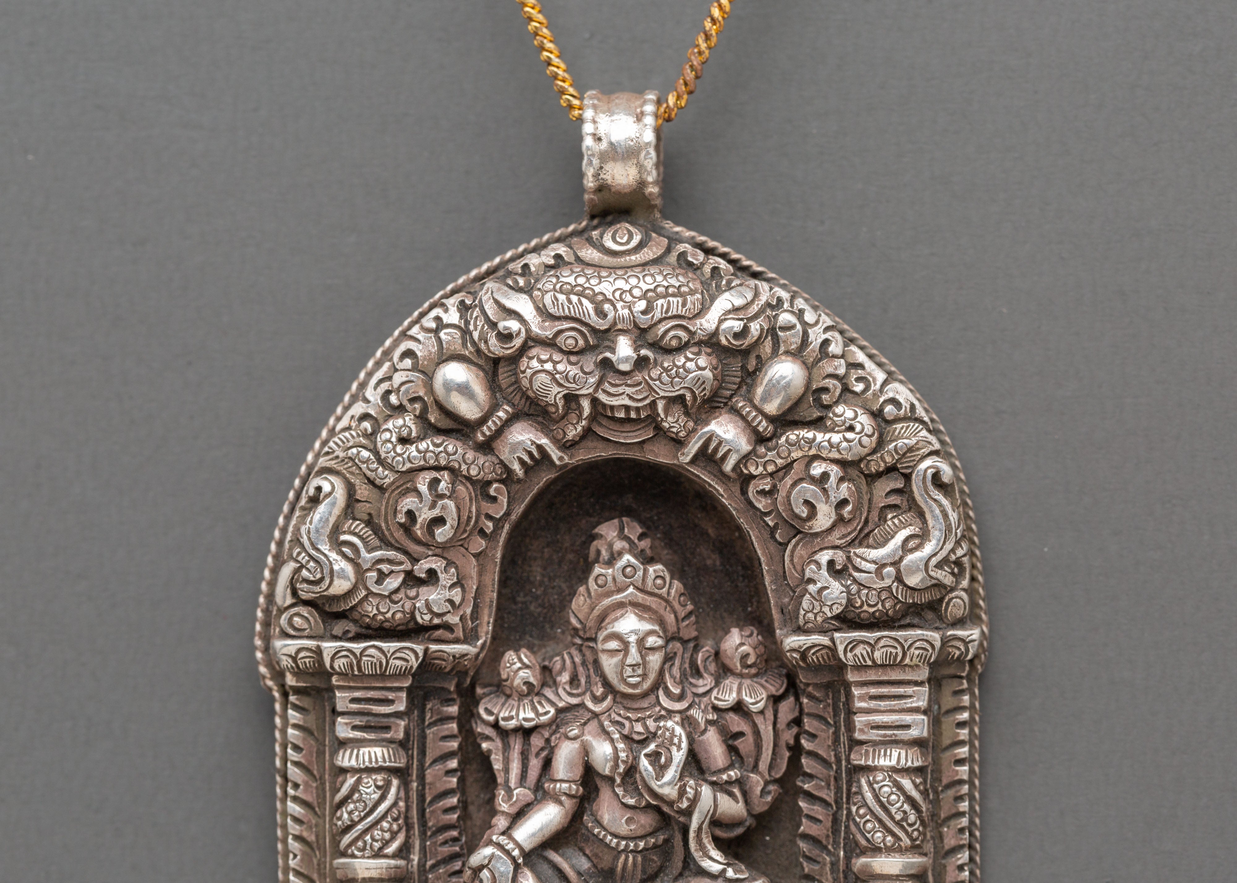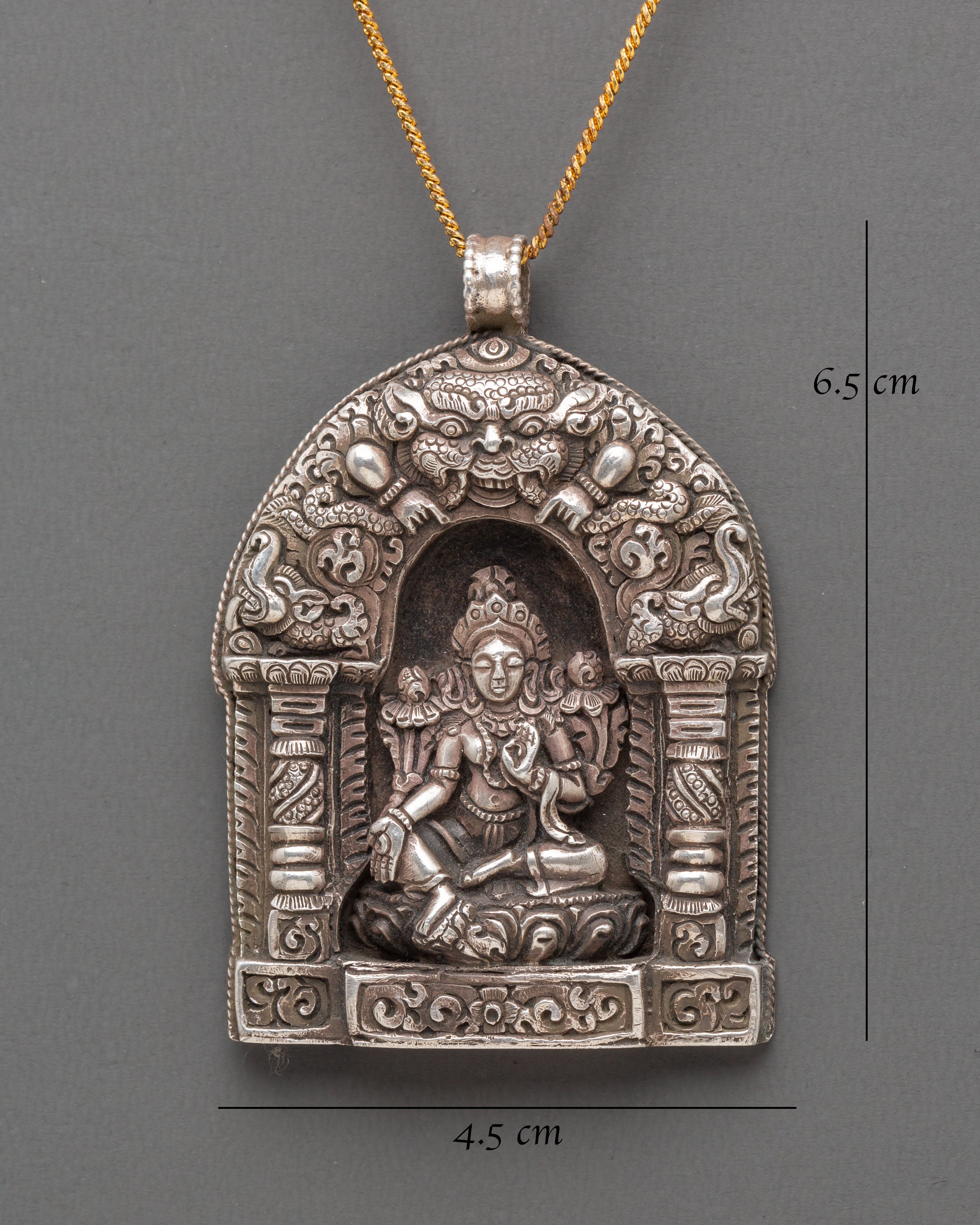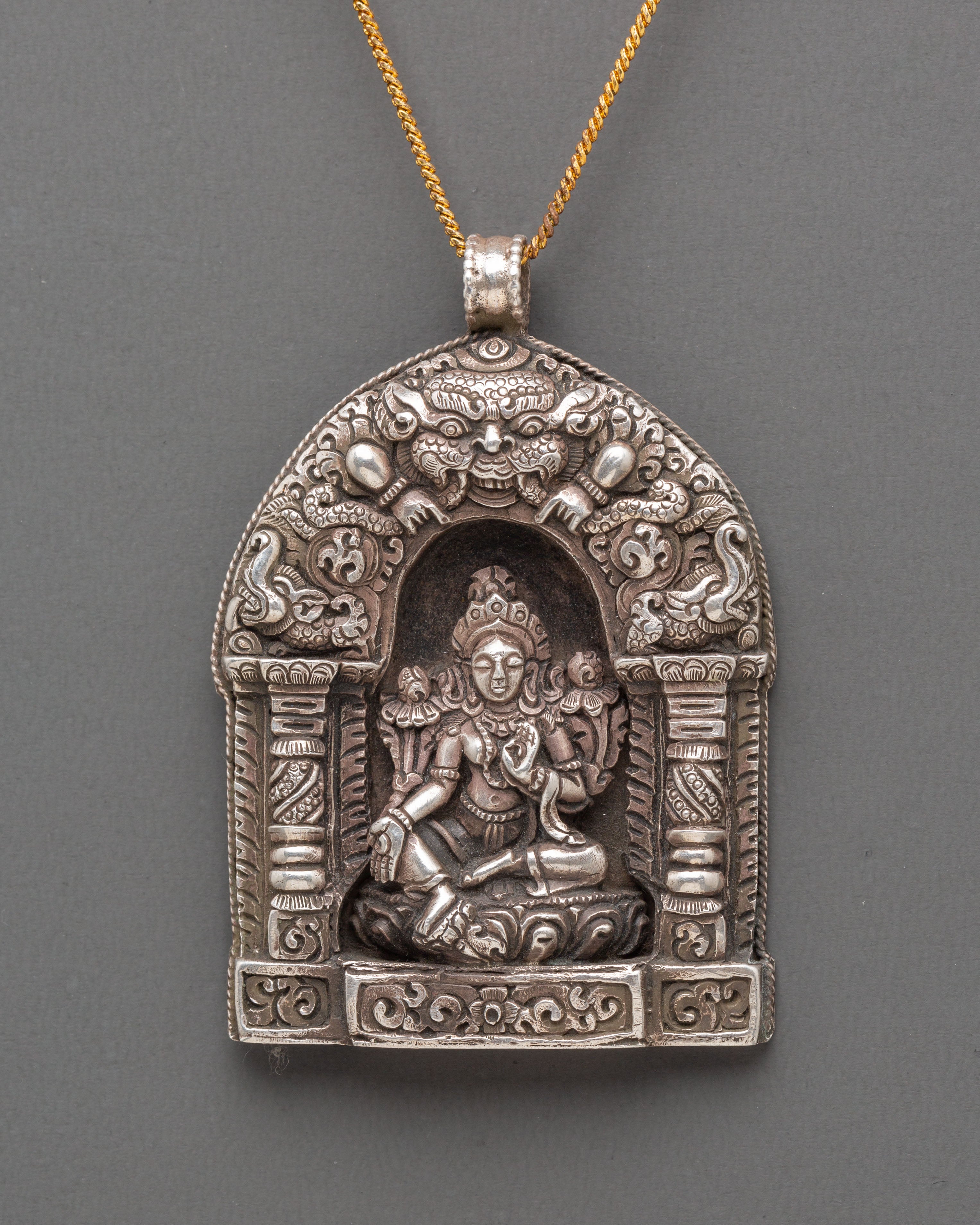 Every detail of this Tibetan Buddhist amulet showcases masterful Nepali artistry. The finely carved silverwork highlights Tara's serene expression, surrounded by intricate dragon and floral motifs. The Chepu figure, symbolizing wisdom and vigilance, crowns the upper part of the design, serving as a divine guardian for the wearer. The combination of smooth silver tones and detailed engraving enhances its sacred aesthetic, making this pendant an exceptional keepsake for meditation or daily wear.