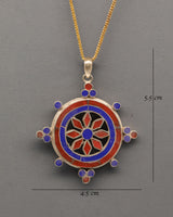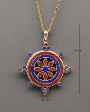 The design follows classic Tibetan prayer locket traditions, where symbolic jewelry is created to carry spiritual meaning. Coral is traditionally associated with protection and vitality, while lapis lazuli represents wisdom and inner awareness. These stones are carefully placed to reflect harmony, balance, and spiritual intention rooted in Buddhist artistic heritage.