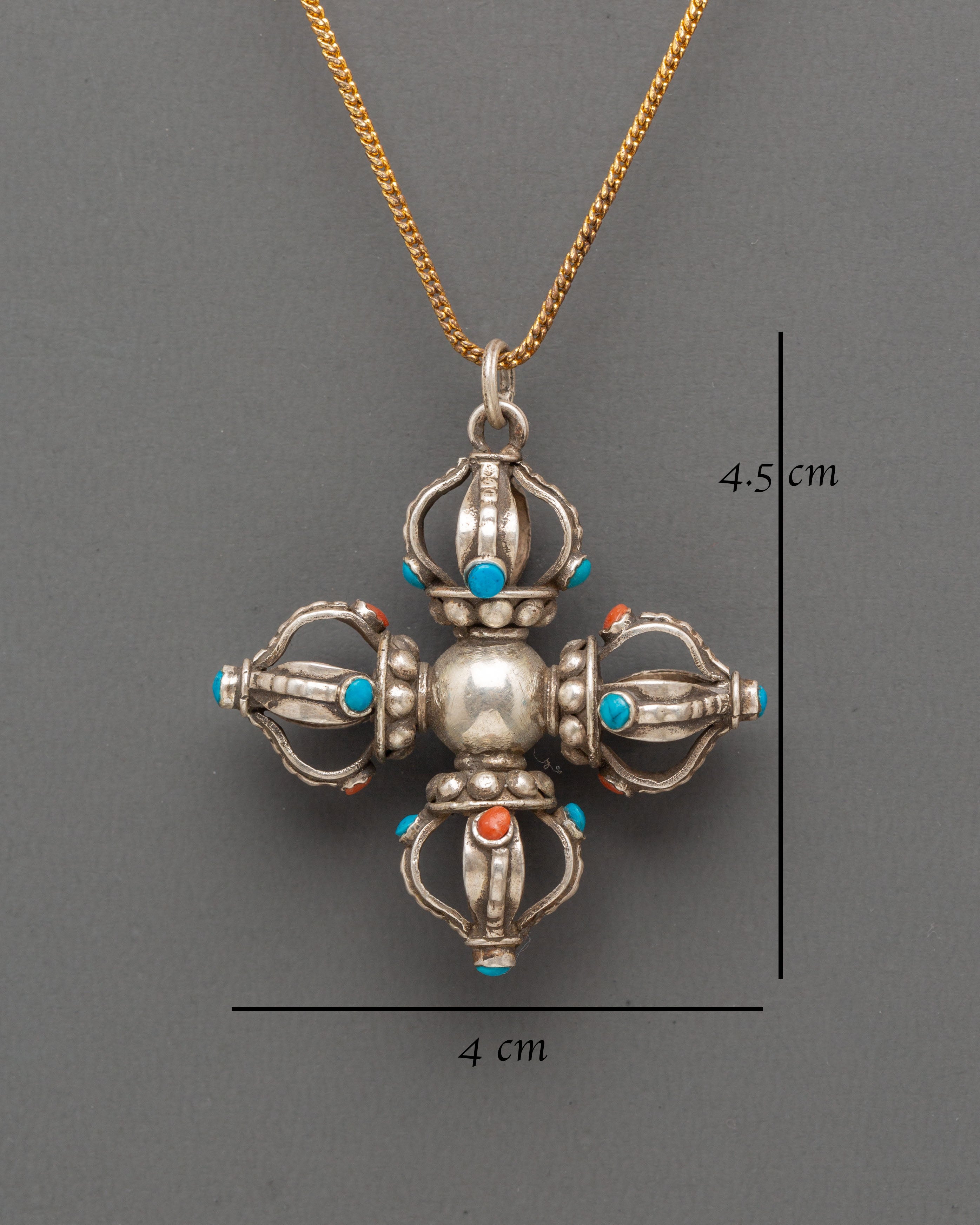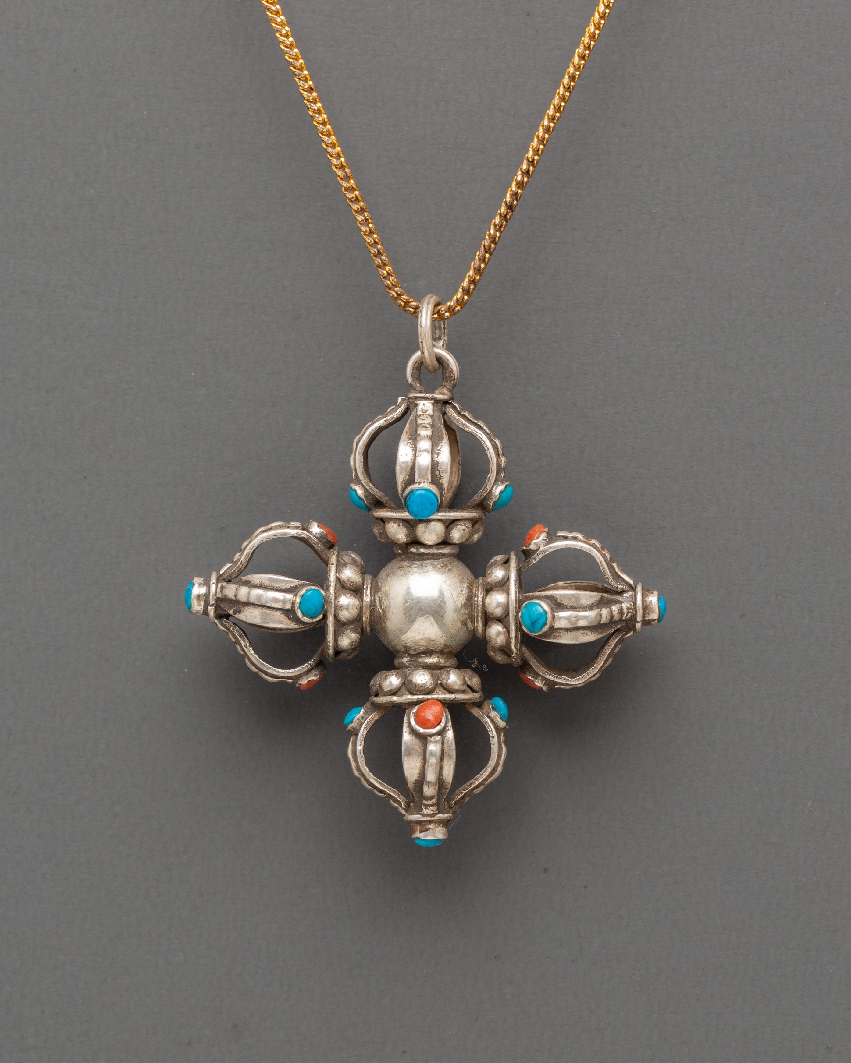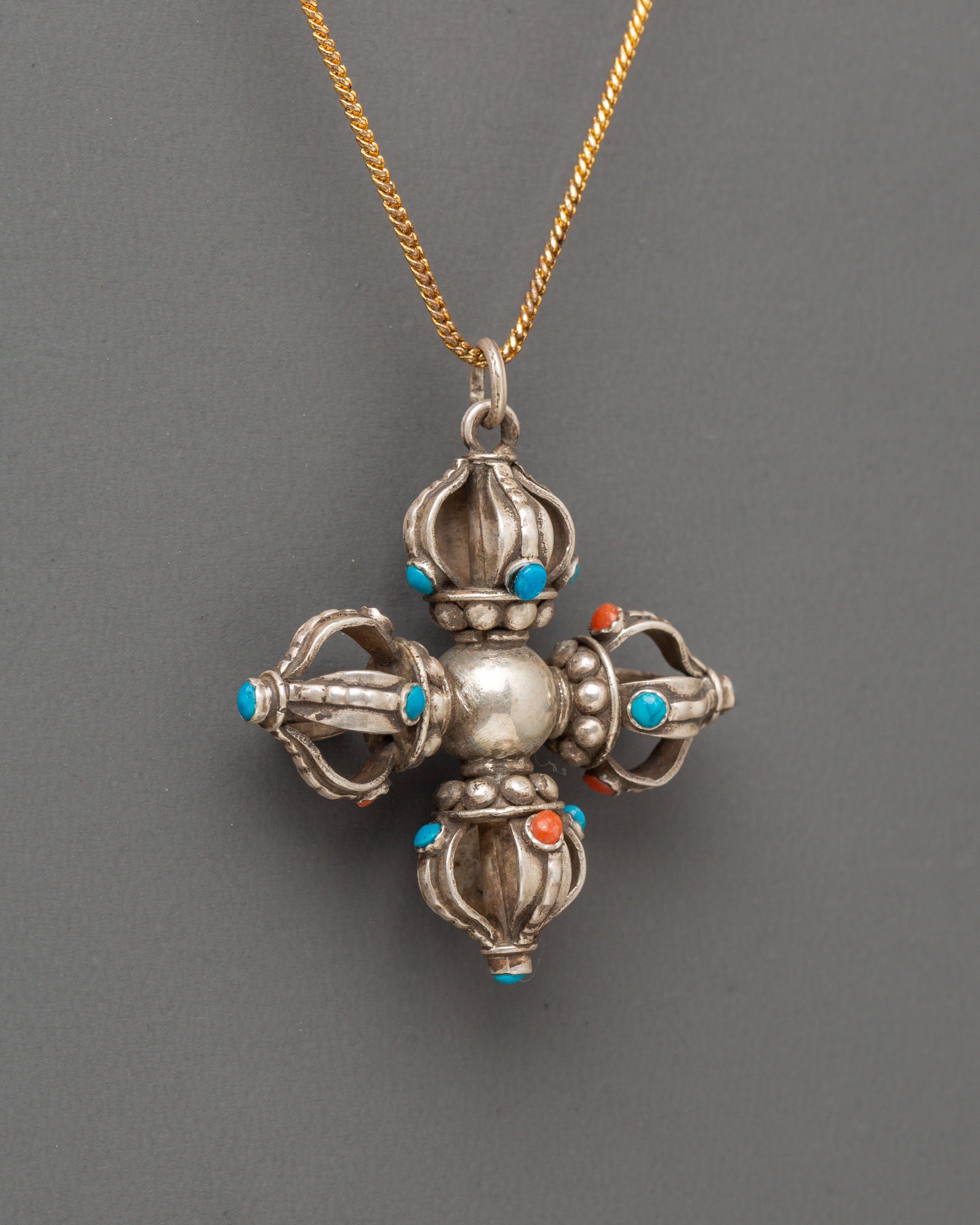 This Tibetan Vishwa Vajra locket showcases masterful craftsmanship and deep spiritual symbolism. The symmetrical four-pronged design radiates from a central sphere, symbolizing the elements, directions, and the balance of cosmic forces. Each arm of the Vajra is gracefully accented with coral and turquoise stones, adding vibrancy and sacred meaning. The use of these stones is believed to promote protection, vitality, and spiritual awareness, while the silver body enhances the locket’s luminous energy and purity.