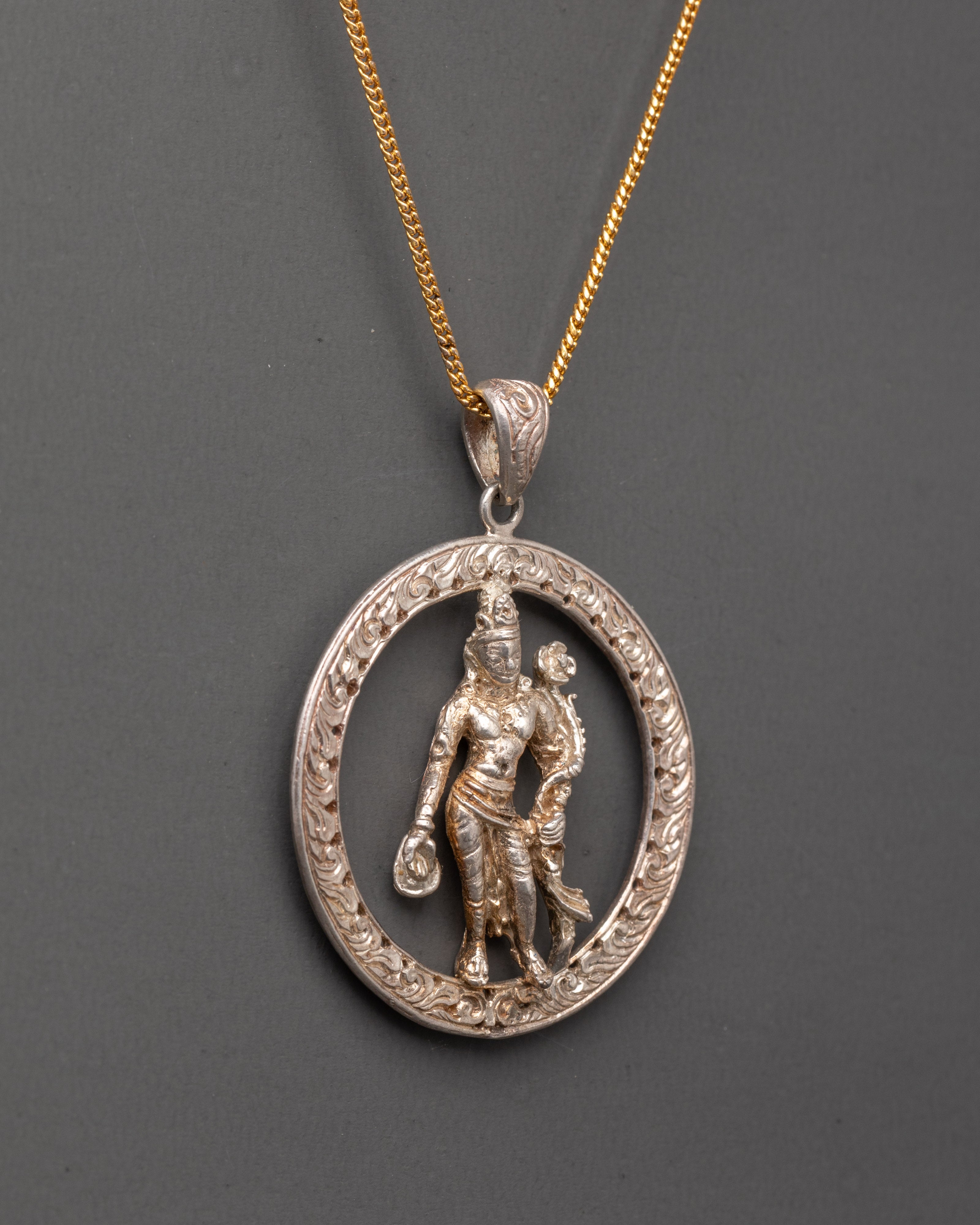 The design of this locket is rich in detail, featuring Lokeshvara in a graceful, compassionate pose, holding a lotus flower in one hand and a bowl in the other. The intricate silver filigree surrounding the figure enhances the pendant's divine presence, symbolizing the purity and enlightenment of the Bodhisattva. The delicate motifs evoke a sense of peace and spiritual balance, reflecting the compassion and wisdom that Lokeshvara embodies. The overall design ensures this piece is not only a beautiful piece of jewelry but also a powerful symbol of spiritual growth and healing.