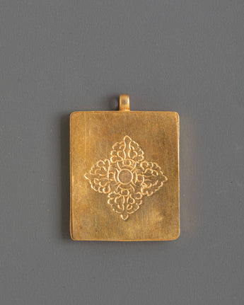 The Padmasambhava Thangka Print Locket is a religious amulet inspired by Guru Rinpoche, the famous tantric guru who introduced Buddhism to Tibet. This locket, measuring 5.5cm in height and 4cm in breadth, is exquisitely created from copper and gold-plated and contains a detailed Tibetan thangka print of Guru Padmasambhava seated on a lotus. His tranquil expression exudes compassion and understanding, while the brilliant background represents divine energy and wisdom. The gold-plated frame is embossed with Tibetan symbols and mantras, which represent protection and spiritual harmony.