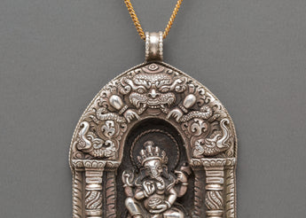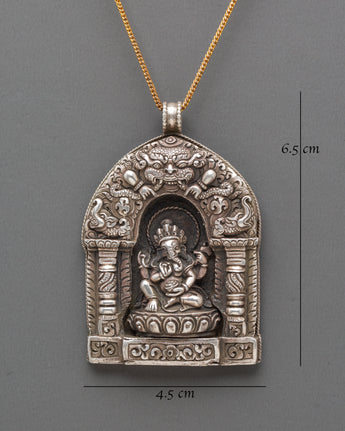 The pendant is beautifully detailed, featuring traditional Nepalese silverwork, with each curve and pattern delicately carved. The arch above Lord Ganesha is embellished with legendary creatures and floral motifs, which symbolize protection, strength, and cosmic harmony. The silver structure has a bright sheen that matches Lord Ganesh's spiritual presence, making this Hindu silver pendant an auspicious amulet as well as a wearable piece of art.