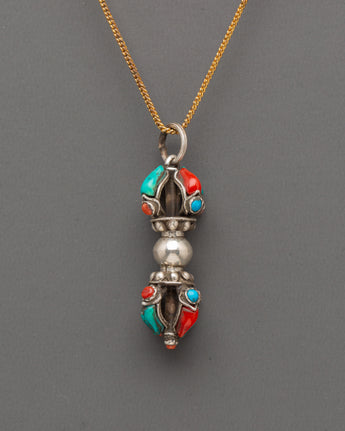 The pendant's design features coral and turquoise, both highly esteemed in Tibetan tradition. Turquoise is regarded as a healing stone, bringing balance and calm, whilst coral represents vigor and protection. Together, these stones heighten the spiritual meaning of the vajra, a potent emblem of protection and spiritual power. The pendant's silver body complements the rocks, giving it a sleek, classic appeal that pairs well with any ensemble.