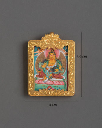 This Wealth Deity Dzambhala Locket perfectly depicts the divine essence of Dzambhala, the Buddhist god of prosperity and wealth. The locket is made of copper and has a gold-plated frame. It is 5.5cm in height and 4cm in breadth. In the center is a vibrant Tibetan thangka print of Dzambhala seated on a lotus, clutching a mongoose that releases countless jewels, a revered symbol of generosity and abundance. The elaborate gold border features delicate motifs inspired by ancient Himalayan creativity, enhancing its spiritual and aesthetic appeal.