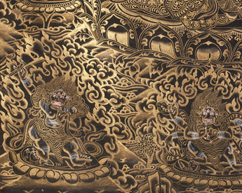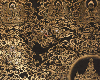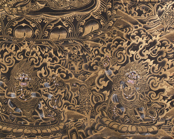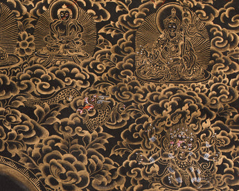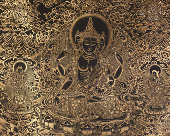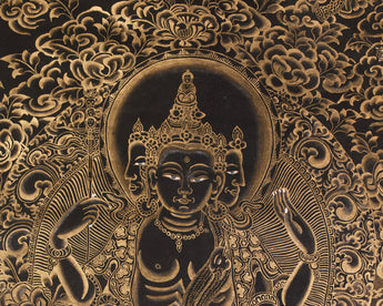 This thangka features the esteemed Lokeshvara, the bodhisattva representing compassion. It is set on a striking black background, with gold accents that bring richness and vibrancy to the artwork. The lively and intricate application of gold elevates the sacred nature of the image, creating a remarkable piece for individuals in search of spiritual connection and visual balance.