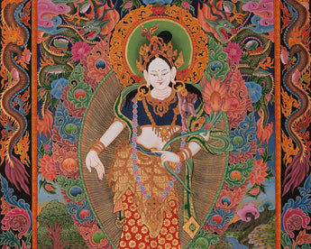 Our thangka is a handpainted Tibetan art done using traditional methods. It is a unique piece created using genuine 24K gold and natural stone colors.