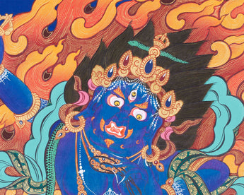 The name Vajrapani means the holder of the Vajra representing the power aspect of complete enlightenment. In the Sutra tradition of Mahayana Buddhism the Bodhisattva Vajrapani is portrayed in a peaceful appearance while in the Vajrayana tradition he is described in his most characteristic wrathful form and known as Guhyapati that means 'the Lord of Secrets' because he is considered as the main recipient and protector of all the sacred Tantra texts, literature, and teachings derived directly from Buddha Shakyamuni.