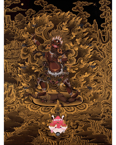 His fierce countenance symbolizes the immense energy that conquers negativity and obstacles rather than representing malevolence. Mahakala is a compassionate deity who ensures that those who follow him remain steadfast on their path to enlightenment, undeterred by challenges.