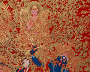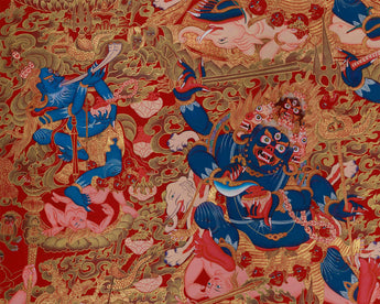 The Six-Armed Mahakala Thangka Print is a high-quality giclée reproduction on cotton canvas, showcasing one of the most formidable guardians in Tibetan Buddhism. It features a deep red background with radiant golden Hues, resembling spiritual ferocity and sacred elegance. The deity, Mahakala, is depicted in a deep blue form, embodying compassion and unwavering resolve. Each of his six arms wields symbolic implements: the trident, sword, noose, skull cup, damaru (ritual drum), and rosary of skulls. These represent his mastery over fear, ignorance, ego, and other forces that hinder spiritual progress.