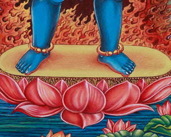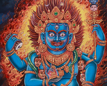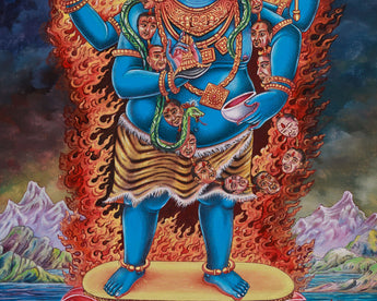 This stunning four-armed Mahakala Thangka print illustrates the mighty and protective essence of Mahakala, a renowned Tibetan deity. His blue skin signifies the infinite aspects of nature and the transformative strength of enlightened insight. Encircled by a halo of flames, his form radiates vibrant energy, representing the triumph over ignorance and ego. Adorned with skulls that symbolize the transitory nature of existence, he wields ritual implements, including a skull cup, associated with tantric traditions. His wild embrace and numerous arms indicate an extraordinary ability to swiftly uphold the Dharma.