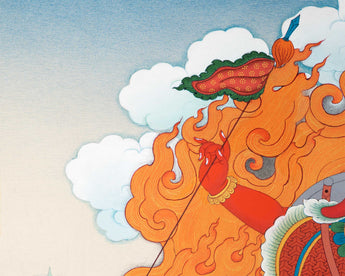The Sonrig Chegha Thangka Print depicts the revered figure as the Divine Guardian of the Faith, embodying qualities of protection and spiritual guidance within Tibetan Buddhism. With a commanding presence and resolute gaze, Sonrig Chegha stands as a stalwart defender against negative influences and obstacles on the path to enlightenment. Clad in divine armor and wielding symbolic weapons, he exudes strength and courage, ready to ward off malevolent forces and safeguard practitioners on their spiritual journey. As the guardian of the faith, Sonrig Chegha inspires unwavering devotion and instills a sense of trust and security in the hearts of devotees. Displayed in homes, meditation spaces, or temples, the Sonrig Chegha Thangka Print serves as a powerful reminder of his protective presence and his role as a divine guardian watching over the faithful with compassion and vigilance.