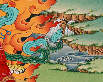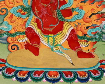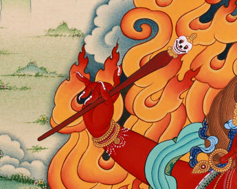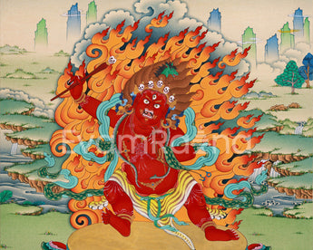 The Spiritual Hayagriva Thangka Print captures the essence of divine wisdom and protection embodied by the revered deity Hayagriva within Tibetan Buddhist tradition. Hayagriva, depicted with a horse's head atop a human body, symbolizes the swift and powerful eradication of ignorance and obstacles on the spiritual path. Crafted with meticulous detail and vibrant colors, this Thangka print radiates with the energy of spiritual enlightenment and inner strength. Hayagriva's fierce yet compassionate presence offers practitioners a source of guidance and protection, inspiring fearlessness and determination in the face of adversity. Displayed in homes, meditation spaces, or sacred altars, this Spiritual Hayagriva Thangka Print serves as a potent reminder of Hayagriva's blessings and the transformative potential of spiritual practice.